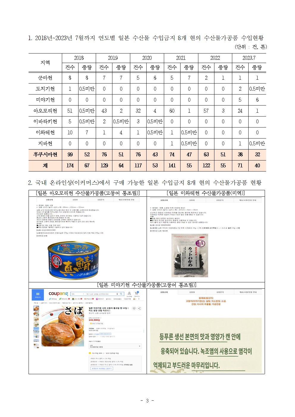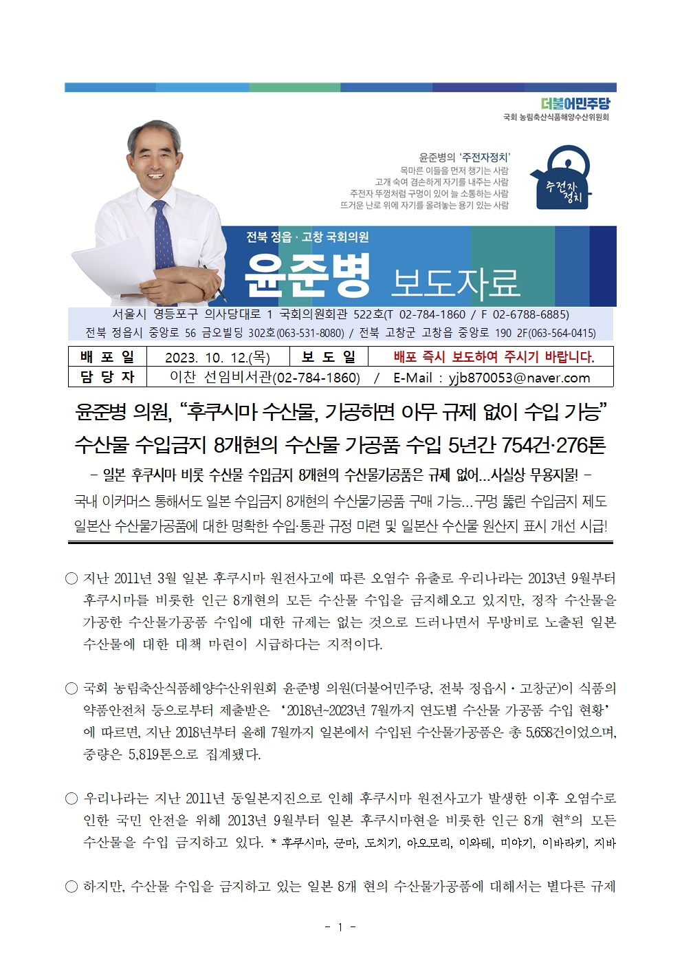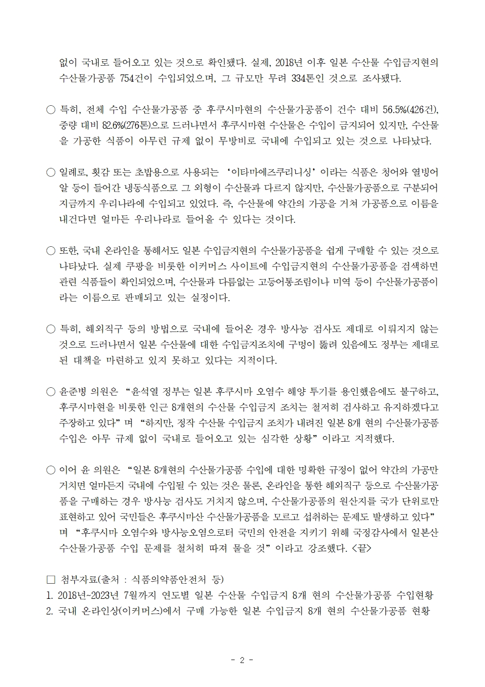 [윤준병 의원 국정감사 보도자료] 윤준병 의원, 수산물 수입금지 8개현의 수산물 가공품 수입 5년간 754건·276톤