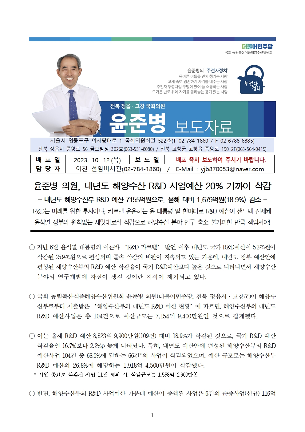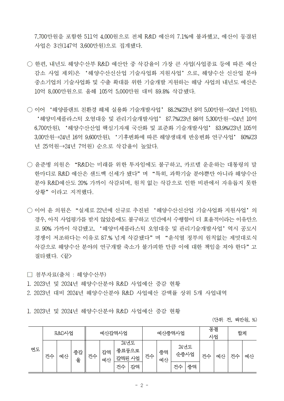 231012 [윤준병 의원 국정감사 보도자료] 윤준병 의원 윤준병 의원 내년도 해양수산 R&D 사업예산 20% 가까이 삭감.hwp