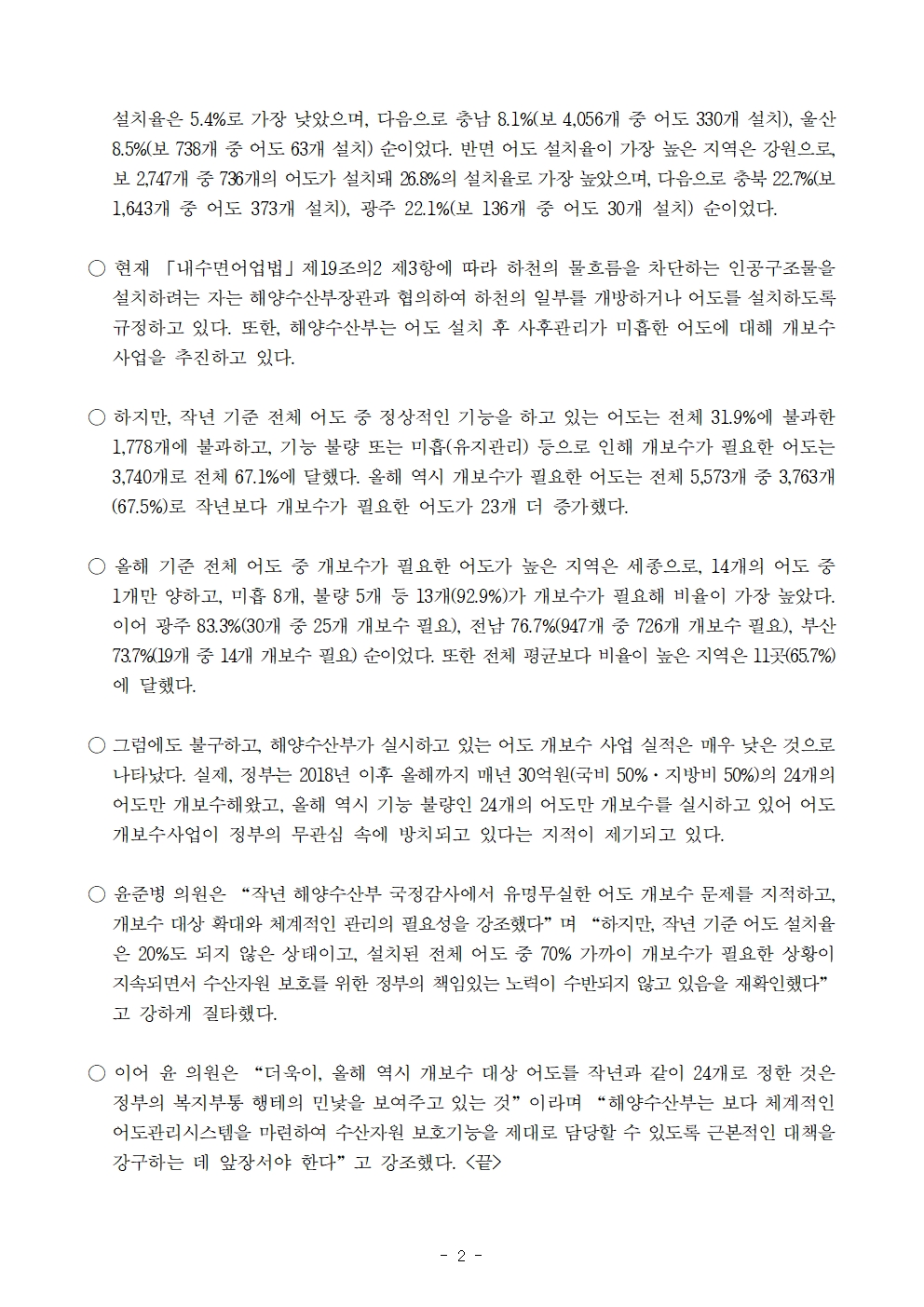[윤준병 의원 국정감사 보도자료] 윤준병 의원, 작년 기준 어도 설치율 16.4% 불과하고 70%가 개보수 필요