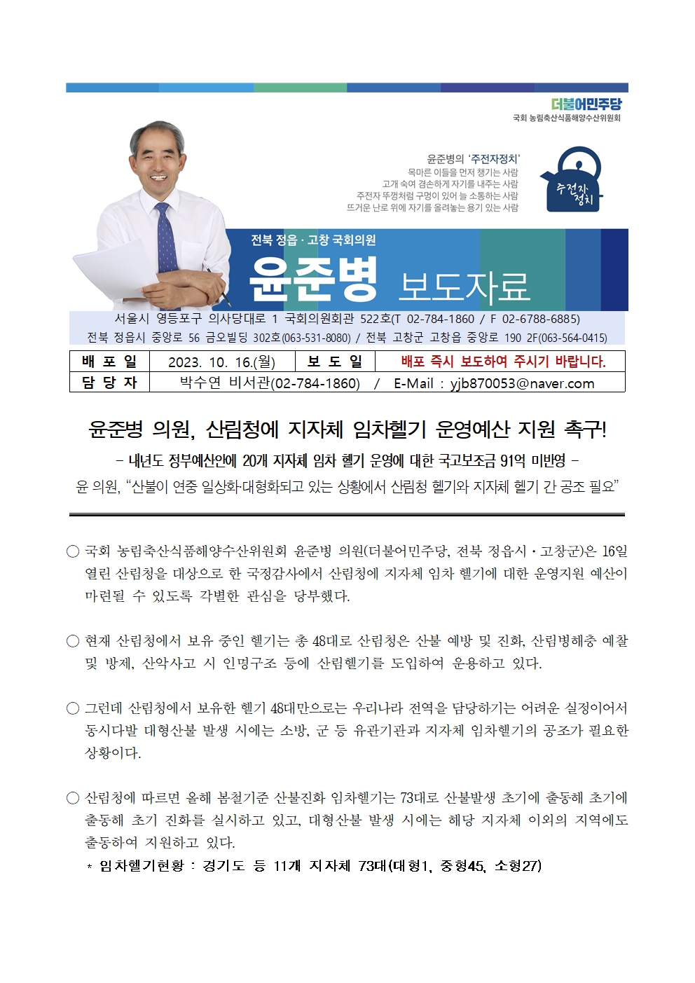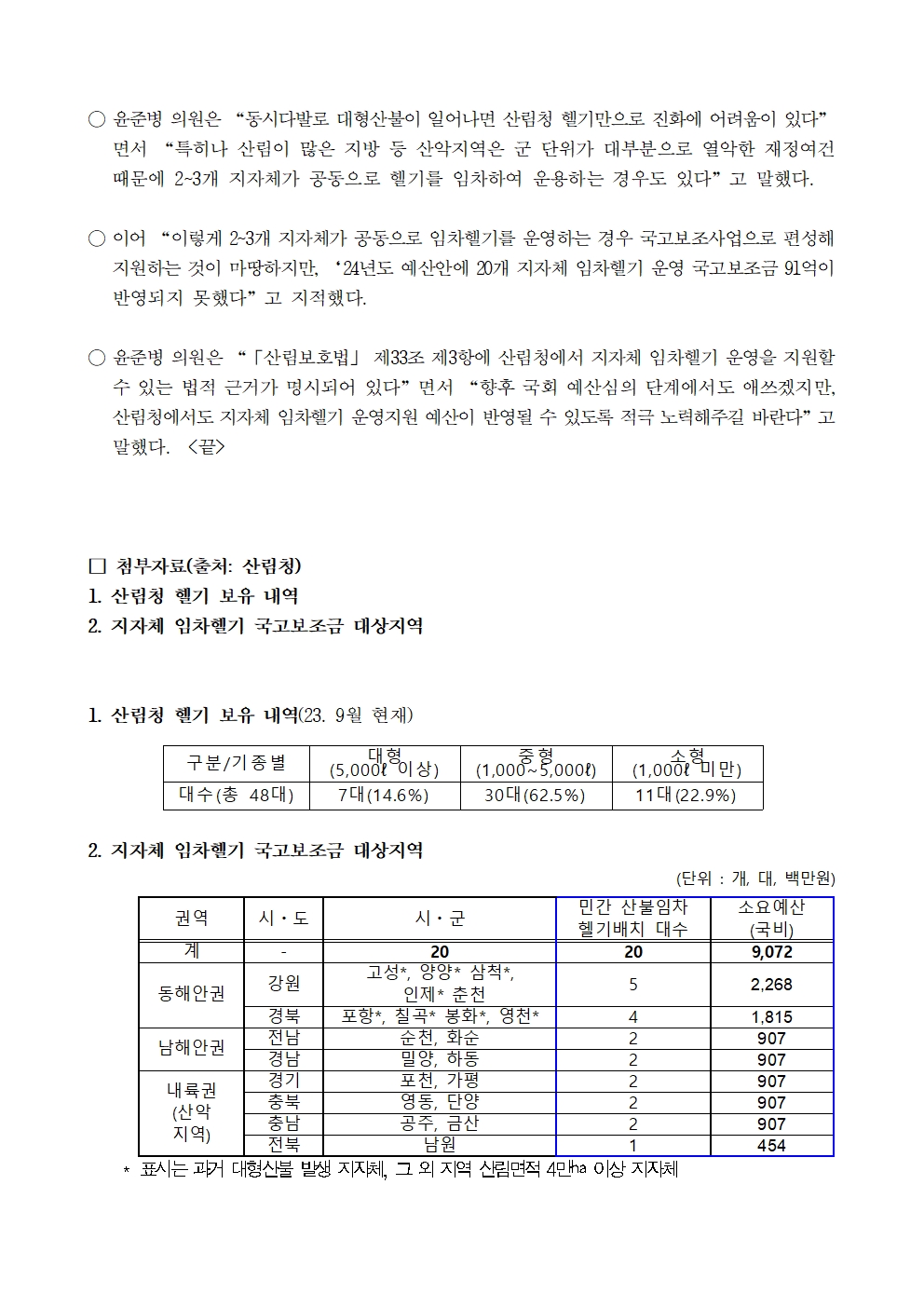 231016 [윤준병 의원 국정감사 보도자료] 윤준병 의원 산림청에 지자체 임차헬기 운영예산 지원 촉구!.hwp