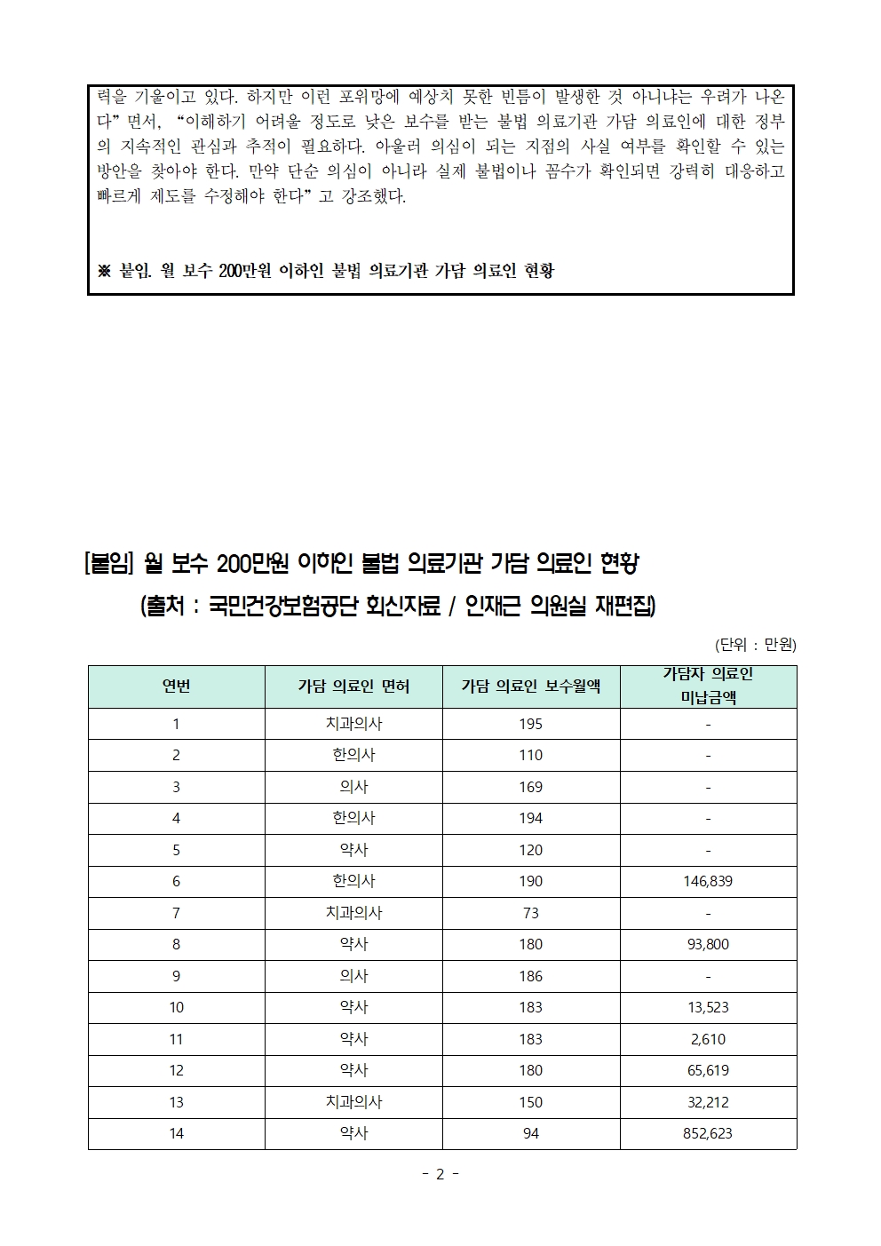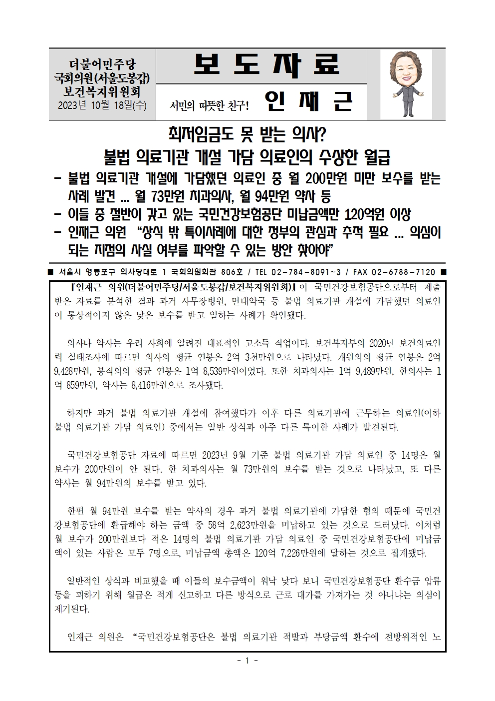 [인재근의원실 보도자료] 최저임금도 못 받는 의사? 불법 의료기관 개설 가담 의료인의 수상한 월급