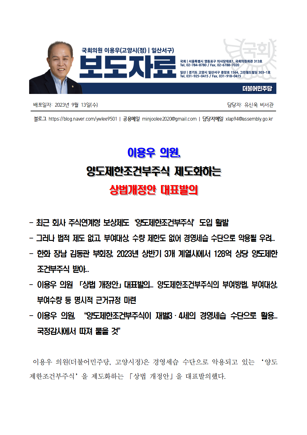 [보도자료] 이용우 의원_ 양도제한조건부주식 제도화하는 상법개정안 대표발의.hwp