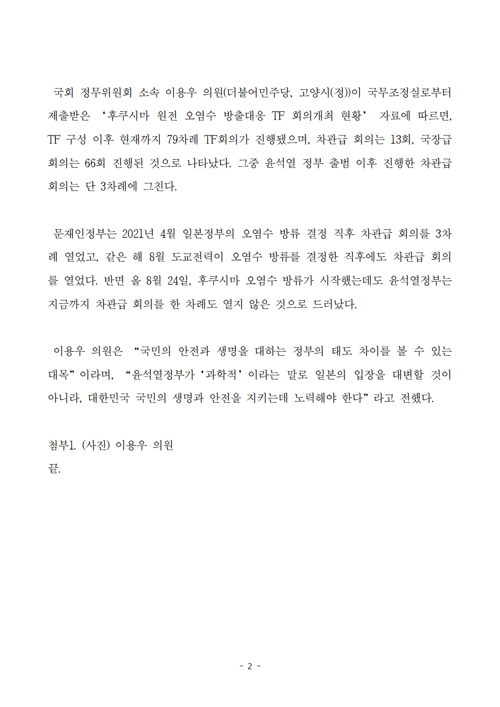 [이용우 의원] 국무조정실 후쿠시마 오염수 방출대응 관계부처TF 윤석열정부에서 차관급 회의는 고작 3회!