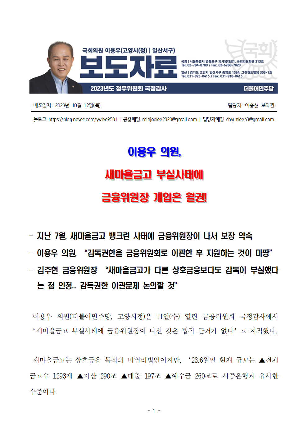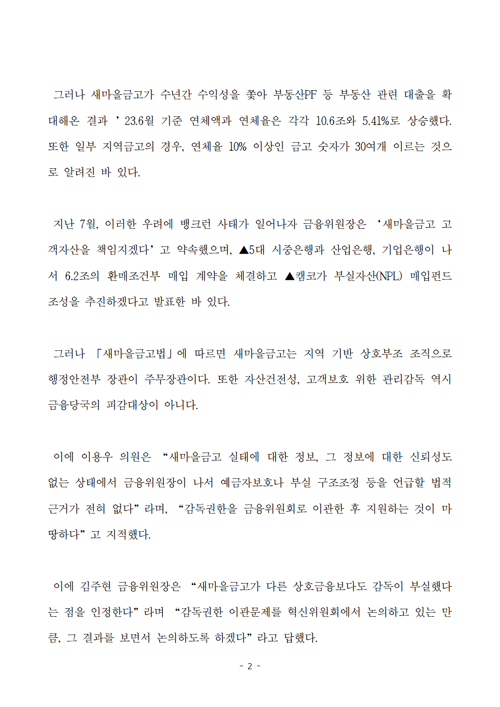 [보도자료] 이용우 의원_ 새마을금고 부실사태에 금융위원장 개입은 월권!.hwp