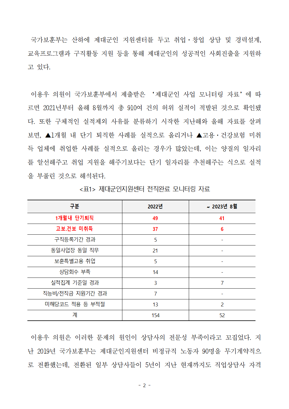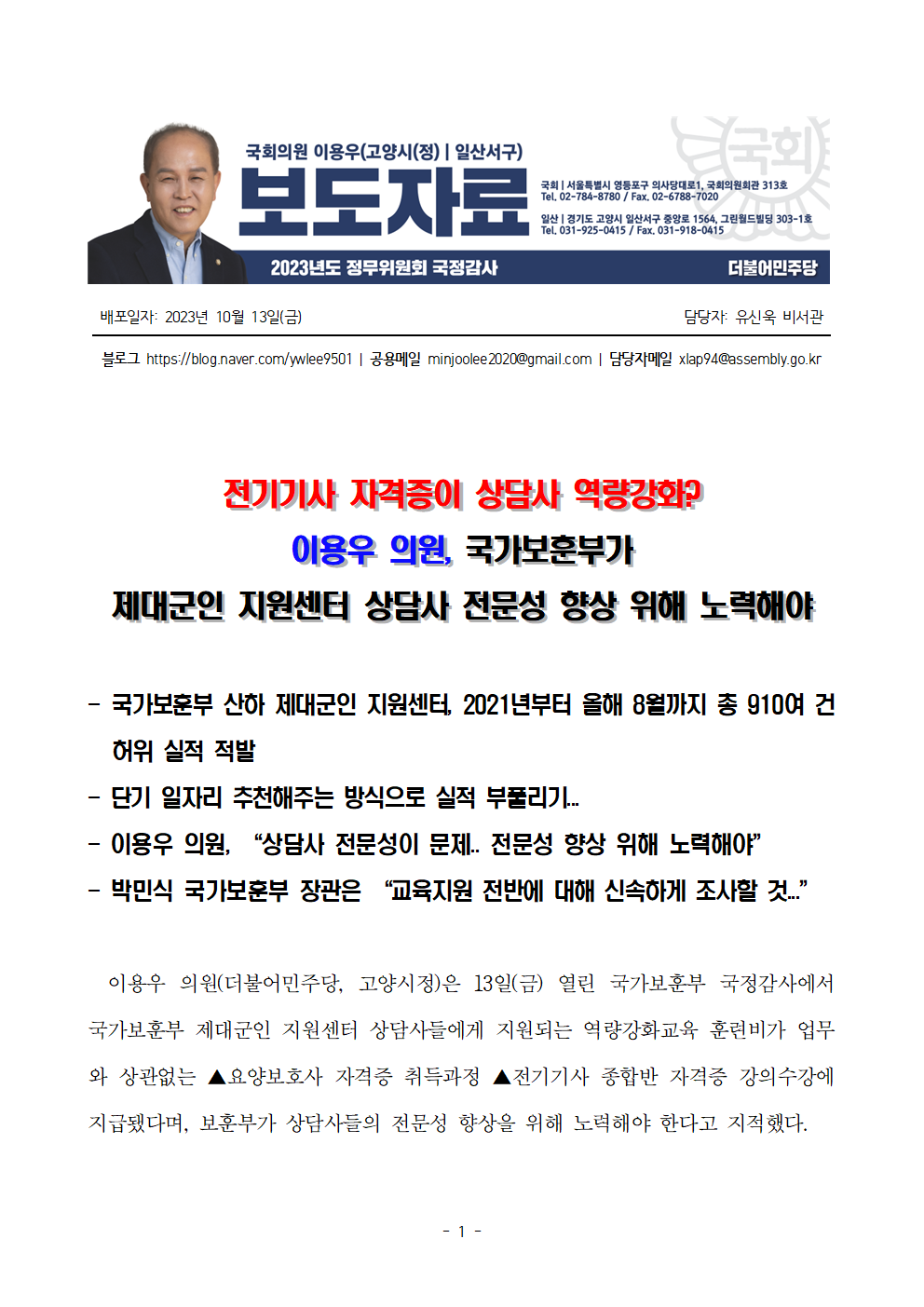 [보도자료] 이용우 의원_ 국가보훈부가 제대군인 지원센터 상담사 전문성 향상 위해 노력해야.hwp