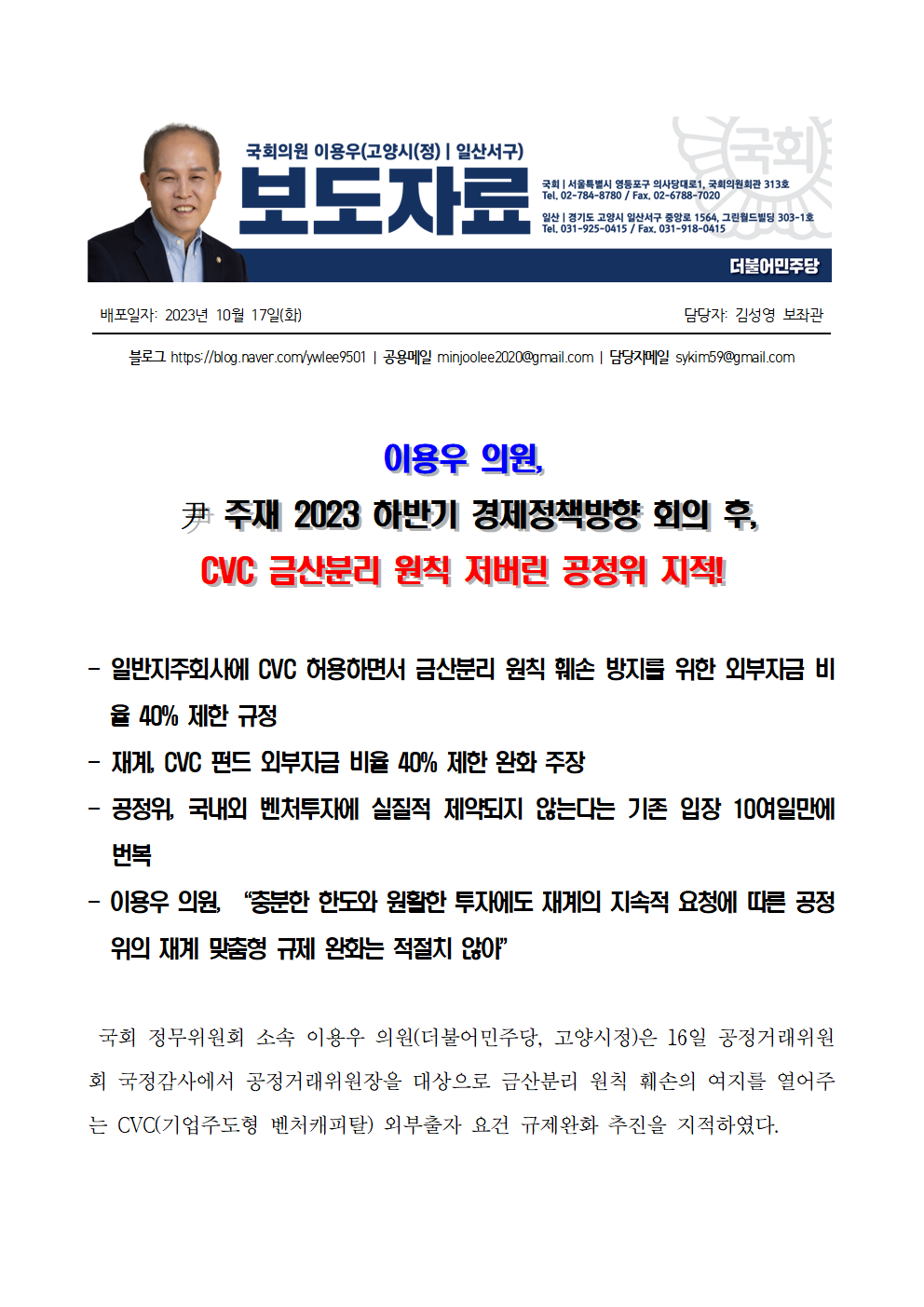 [보도자료] 이용우 의원_ 尹 주재 2023 하반기 경제정책방향 회의 후_ CVC 금산분리 원칙 저버린 공정위 지적.hwp