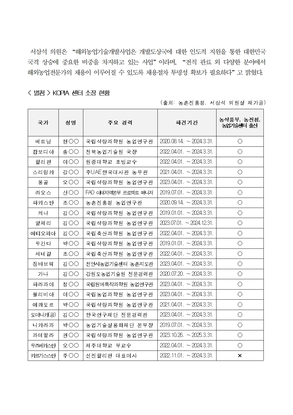 231018_[서삼석 국회의원] 농촌진흥청 KOPIA 센터장 95% 퇴직관료... 제 식구 챙기기 도 넘어.hwp