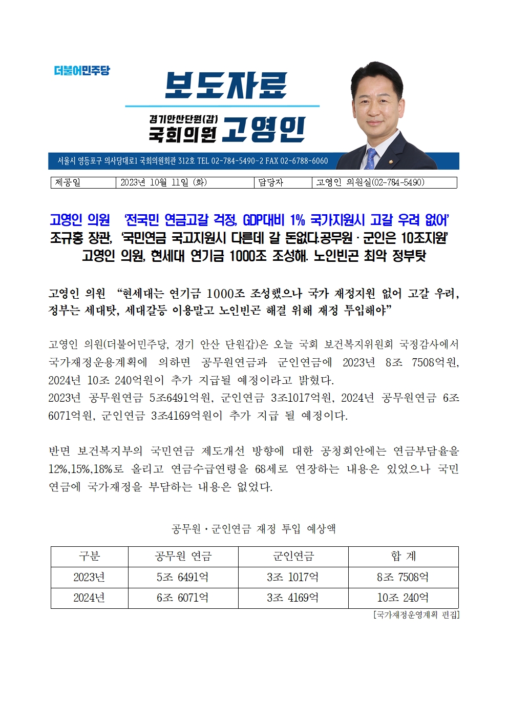 [국정감사 보도자료] 고영인 의원 ‘전국민 연금고갈 걱정, GDP대비 1% 국가지원시 고갈 우려 없어’
