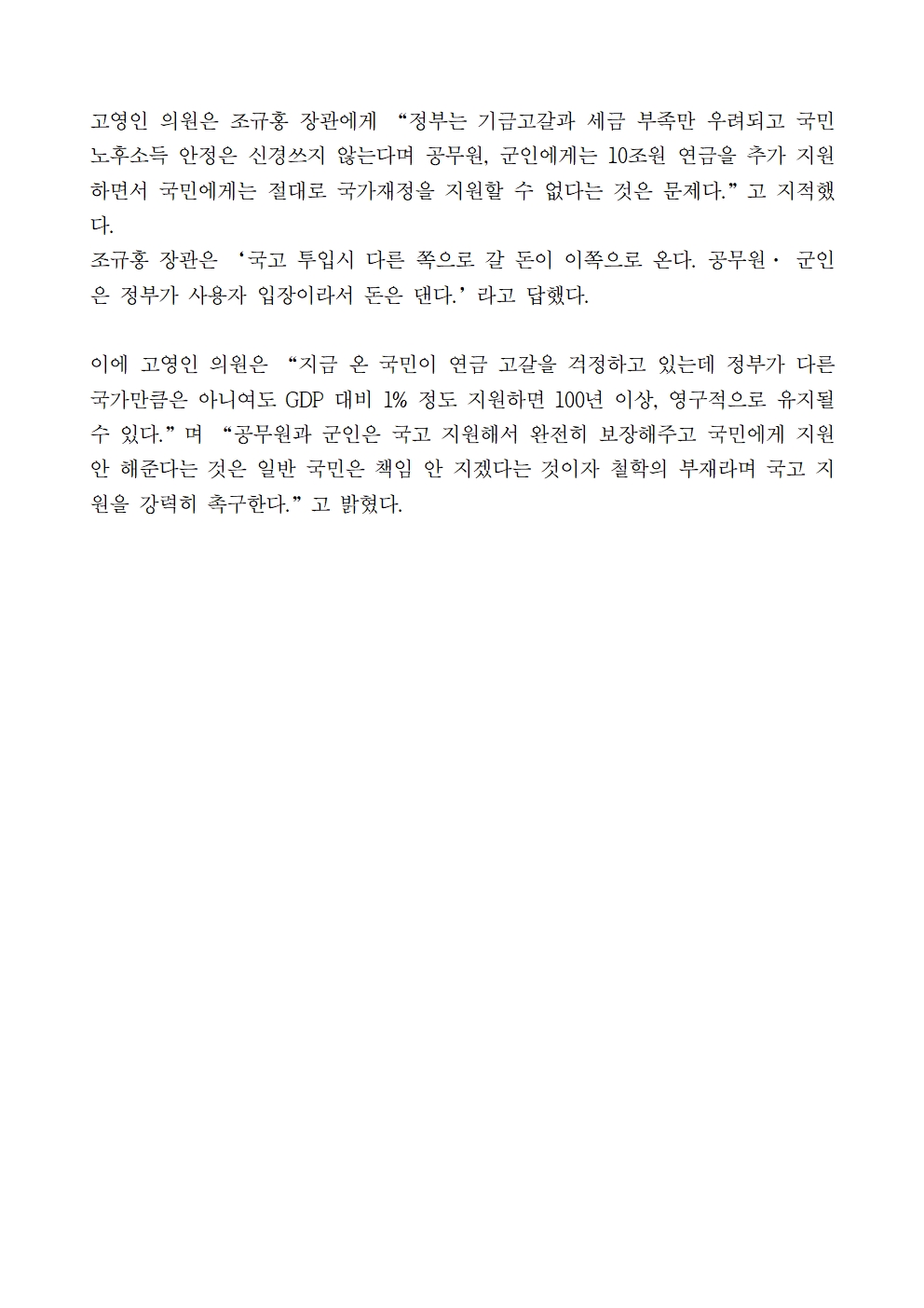 국정감사_보도자료_고영인_의원_‘전국민_연금고갈_걱정__GDP대비_1%_국가지원시_고갈_우려_없어’.hwp