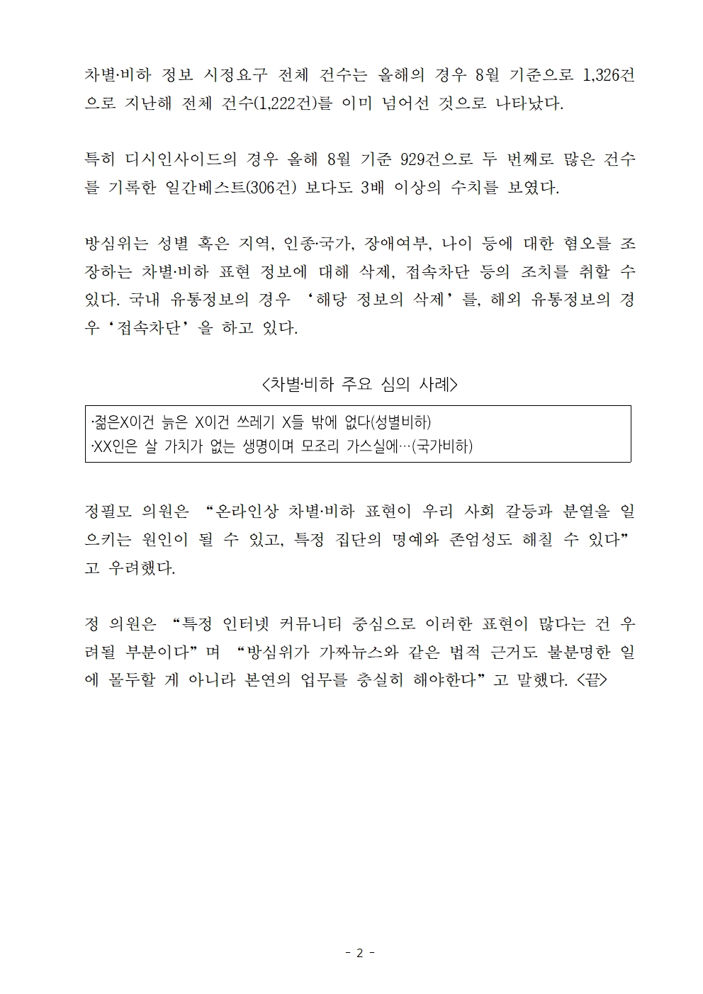[정필모 의원 보도자료] 성별‧지역 등 혐오조장 차별‧비하 표현 ‘디시’‧‘일베’에 집중