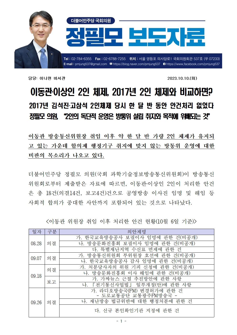 231010_국정감사_보도자료_방통위_이동관‧이상인_2인_체제_2017년_2인_체제와_비교하면_정필모의원.hwp