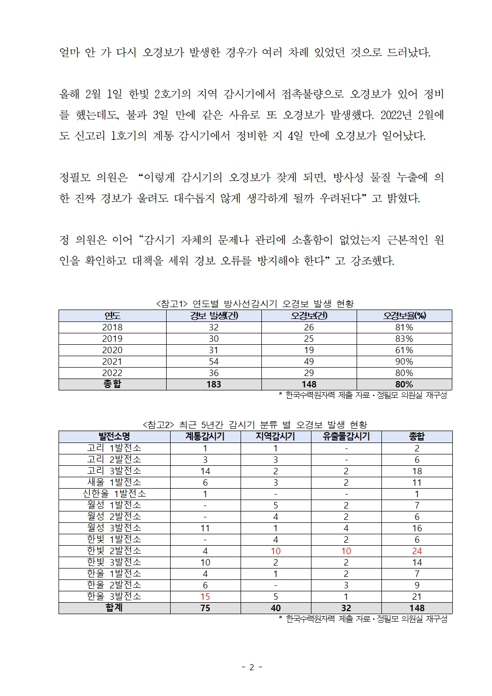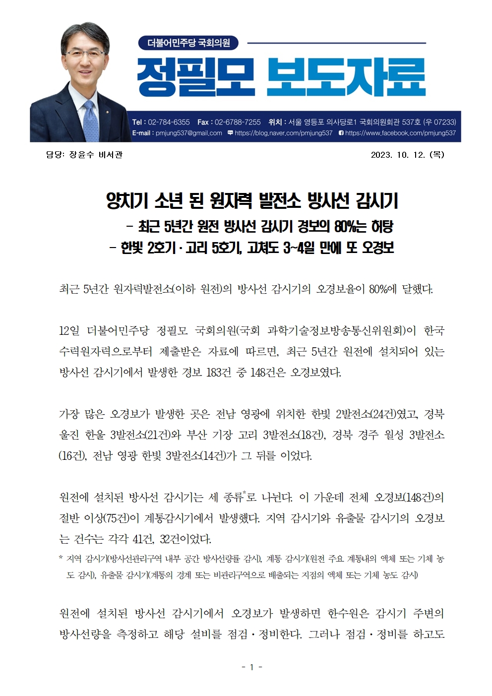 [정필모 의원 보도자료] 양치기 소년 된 원자력 발전소 방사선 감시기