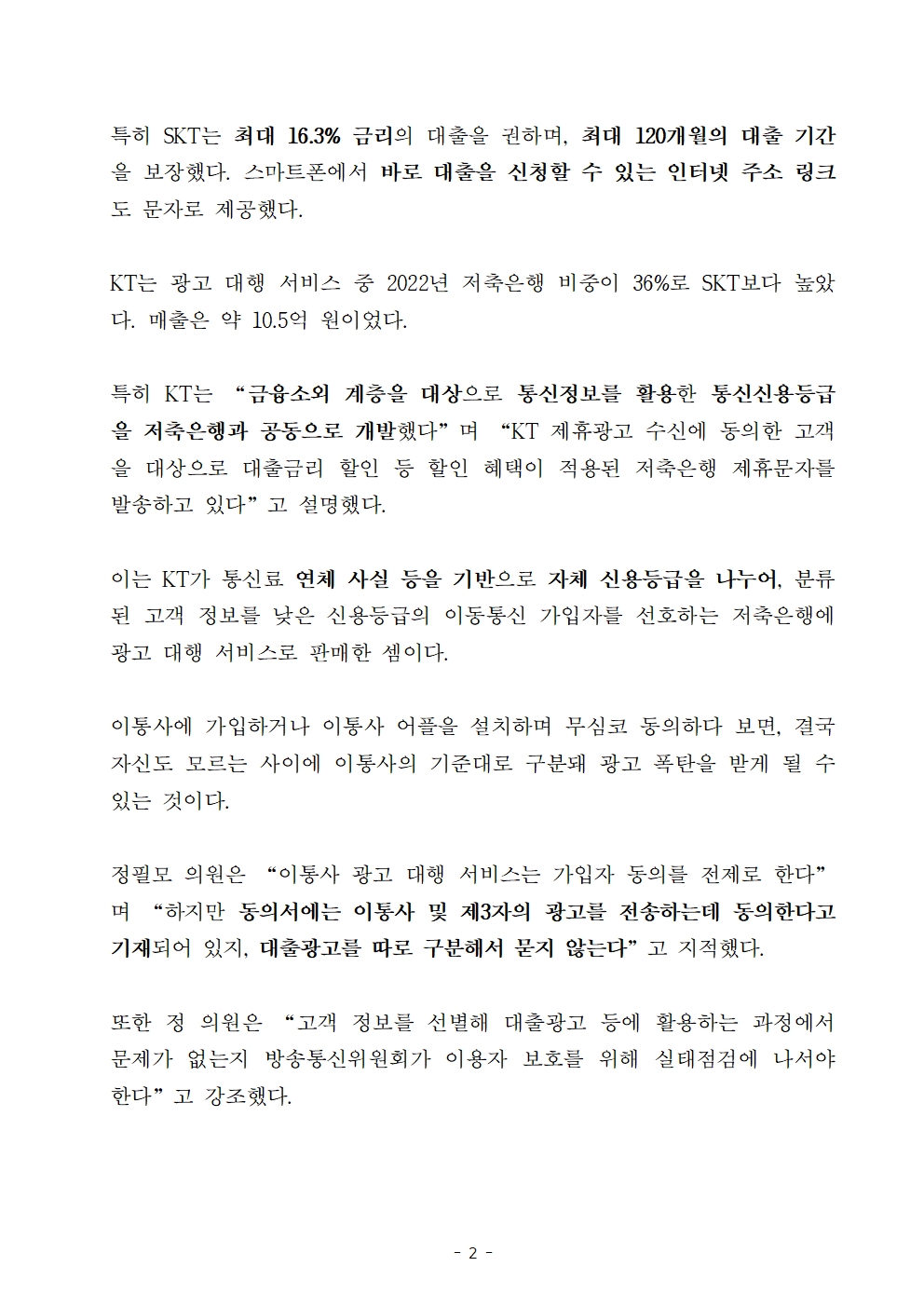 [정필모 의원 보도자료] 무심코 SKT·KT 동의, 대출광고 문자 폭탄