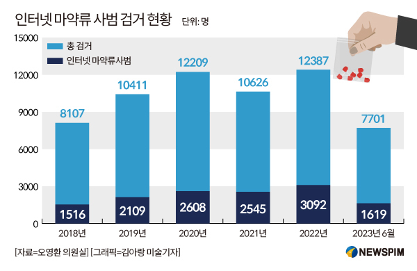 법무부의 5년간 인터넷 마약류 사범 검거 현황 통계를 보면, ▲2018년 1516명(18.7%) ▲2019년 2109명(20.3%) ▲2020년 2068명(21.4%) ▲2021년 2545명(24.0%) ▲2022년 3092명(24.9%) ▲2023년 6월 기준 1619명(21.0%)으로 매년 꾸준히 증가했다.