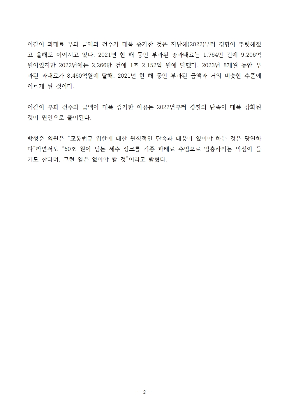 [국회의원 박성준_보도자료]231003_경찰교통법규 위반 과태료 부과액 2년 만에 59% 2727억원 증가해.hwp