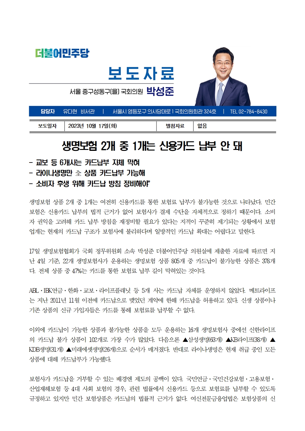 [국회의원 박성준_보도자료]231017_생명보험 2개 중 1개는 신용카드 납부 안 돼.hwp