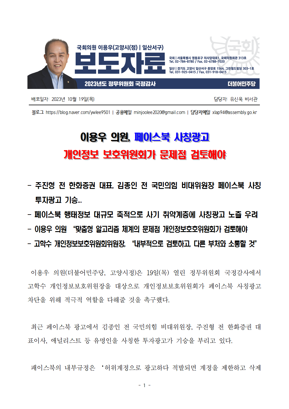 [보도자료] 이용우 의원 페이스북 사칭광고 개인정보호호위원회가 문제점 검토해야.hwp