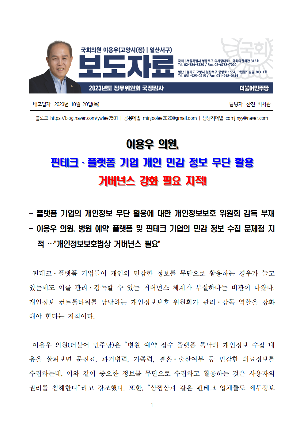[이용우 의원] 이용우 의원, 핀테크·플랫폼 기업 개인 민감 정보 무단 활용 거버넌스 강화 필요 지적!