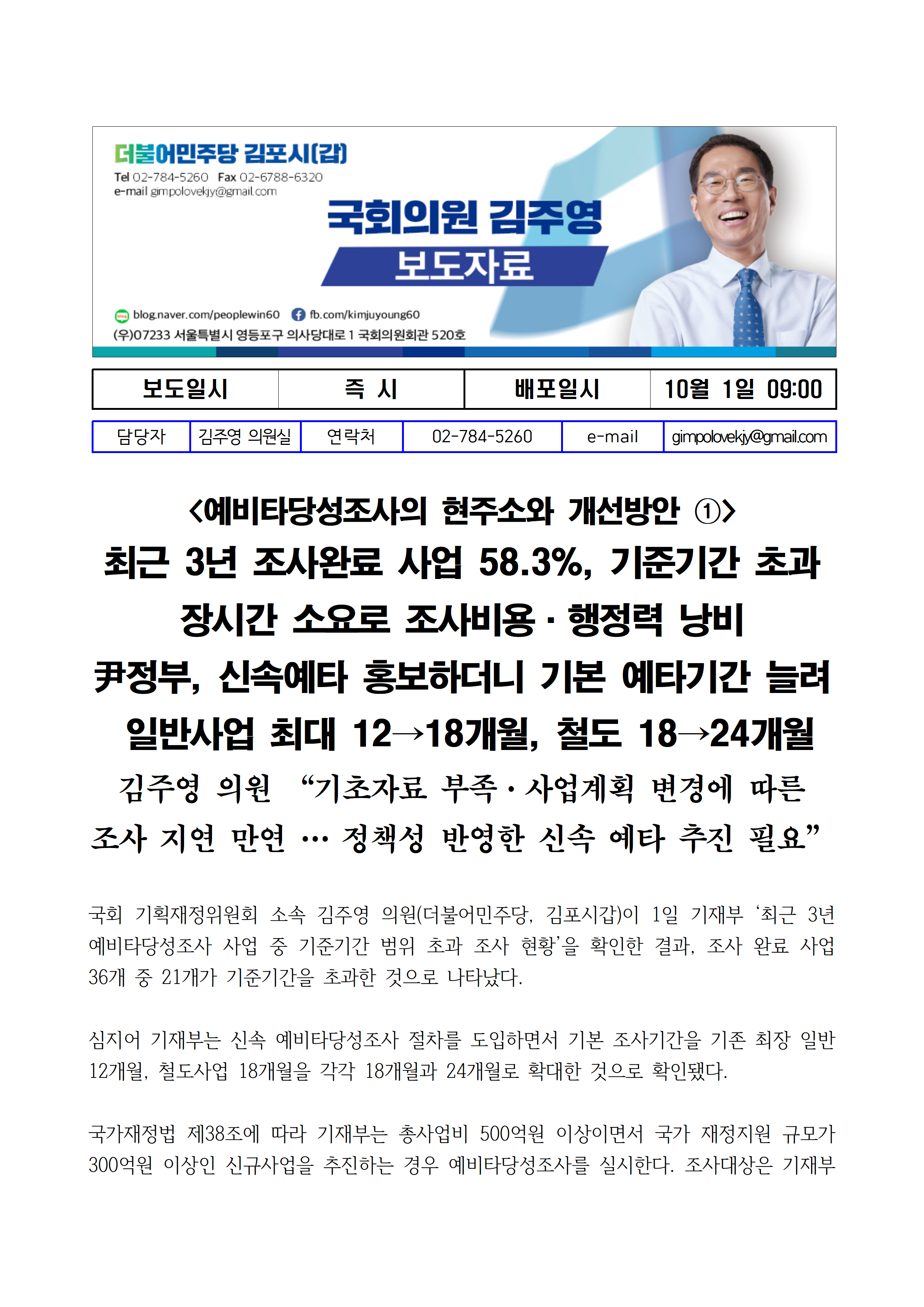 231001_국감보도자료_김주영_의원_예비타당성조사의_현주소와_개선방안①_최근_3년_조사완료_사업_58%_기준기간_초과.hwp