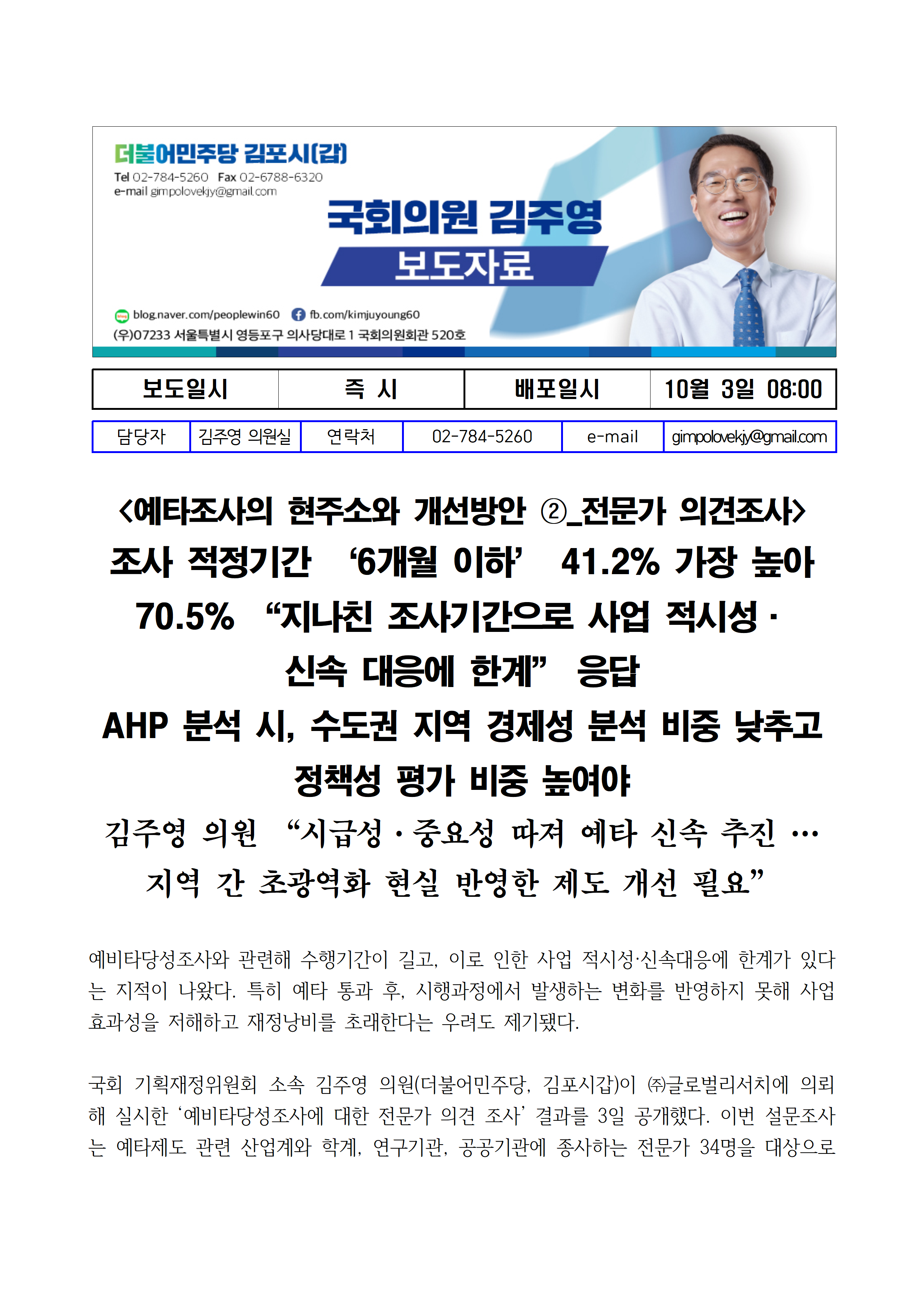 231003_국감보도자료_김주영_의원_예비타당성조사 현주소와 개선방안②_전문가조사_70.5% 지나친 조사기간에 사업 적시성 신속대응에 한계 응답.hwp