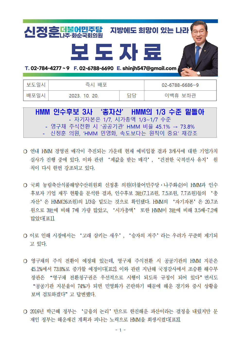 [신정훈 의원 보도자료] HMM 인수후보 3사 ‘총자산’ HMM의 1/3 수준 밑돌아