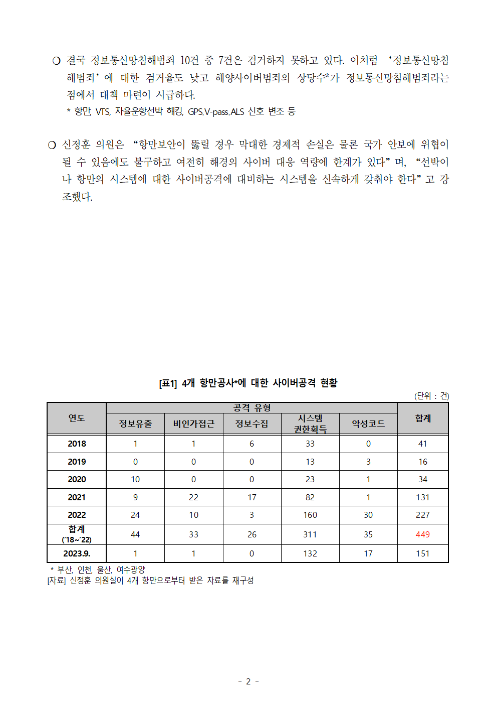 [신정훈 의원 보도자료] 항만 사이버공격 지난해 227건, 2018년 比 5.5배 증가... 해양사이버 수사 대응체계 구축 필요