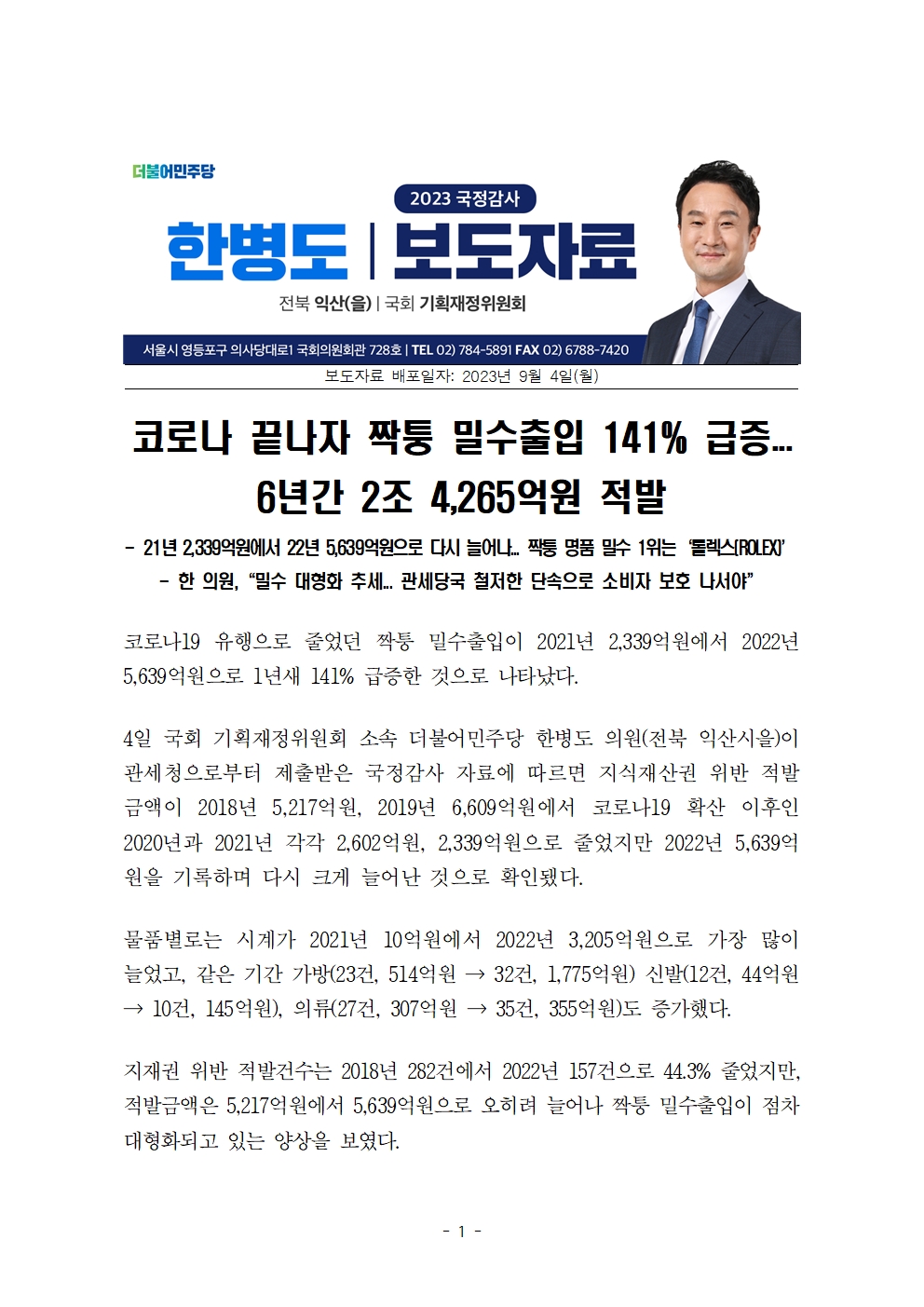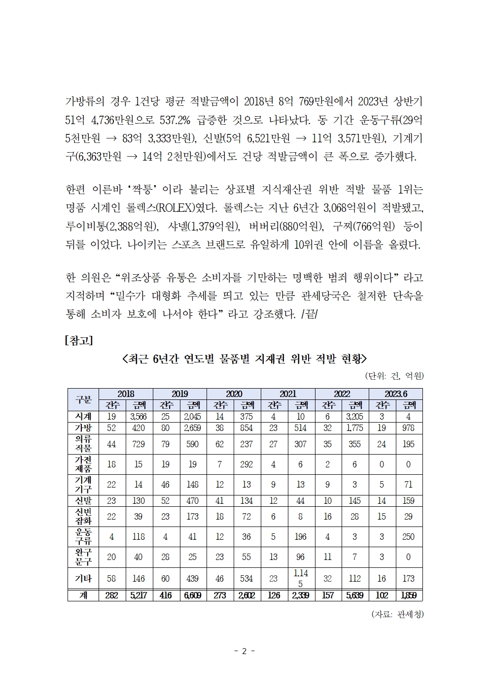 [한병도의원]2023기재위국정감사보도자료(3)_코로나 끝나자 짝퉁 밀수출입 141퍼센트 급증... 6년간 2조 4265억원 적발.hwp