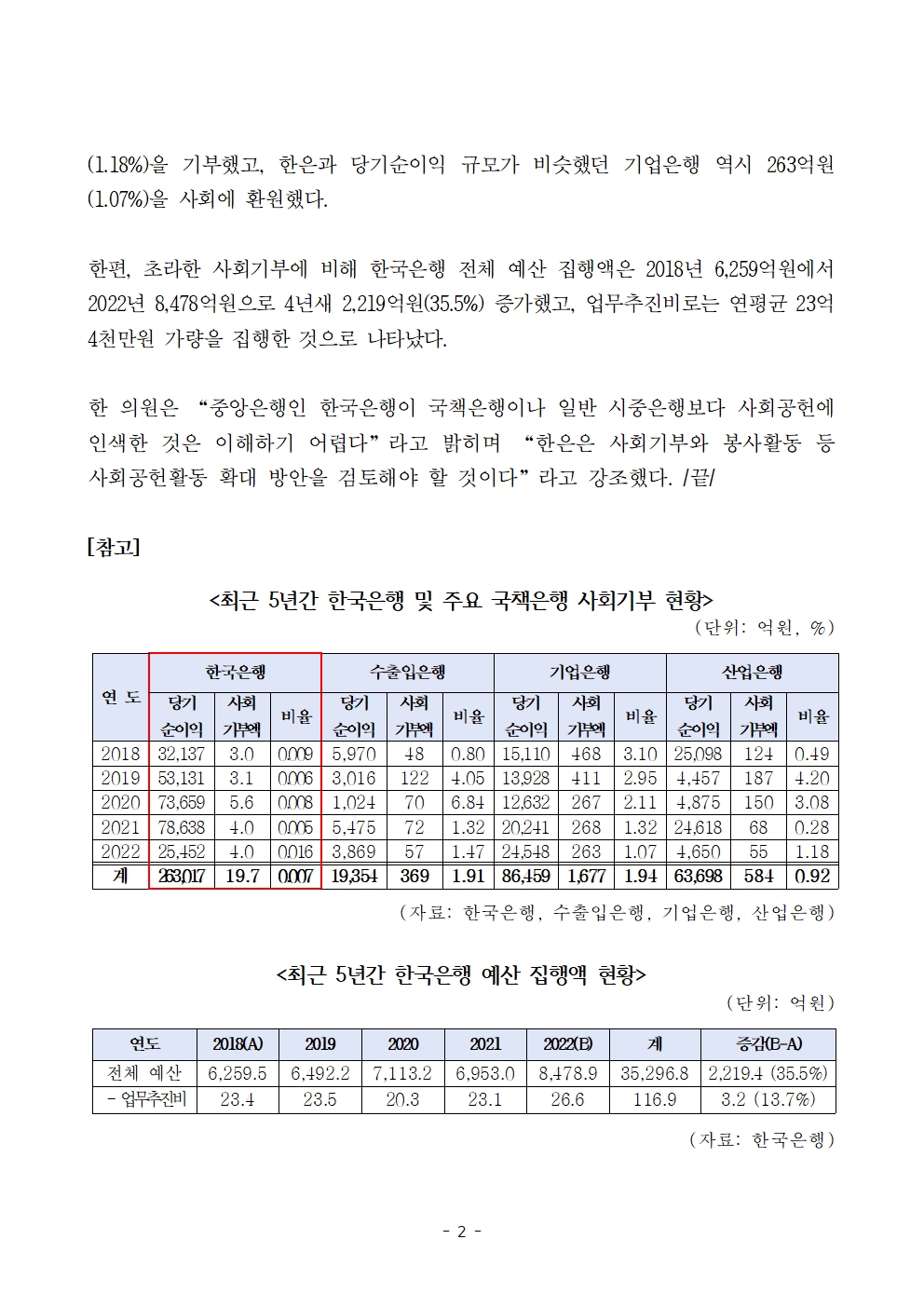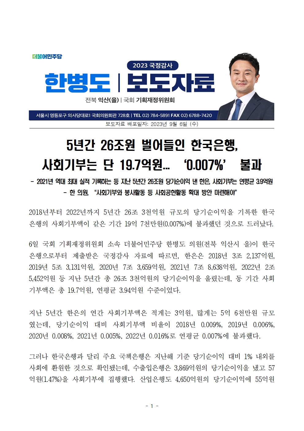 [한병도의원]2023기재위국정감사보도자료(5)_5년간 26조원 벌어들인 한국은행 사회기부는 단 19.7억원... ‘0.007퍼센트’ 불과.hwp