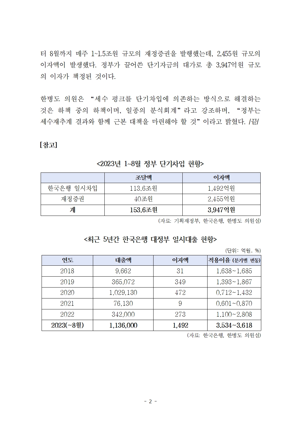 [한병도의원]2023기재위국정감사보도자료(6)_‘세수 펑크’에 단기자금 150조원 끌어쓴 정부... 이자만 4000억원 육박.hwp