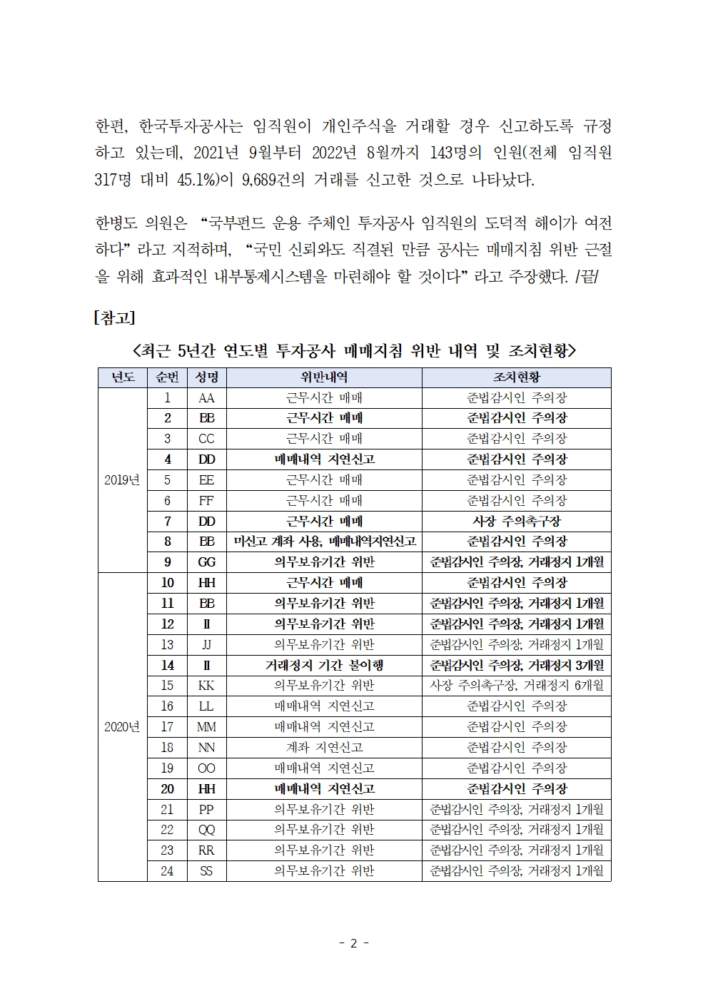 [한병도의원]2023기재위국정감사보도자료(9)_나랏돈 굴릴 시간에 내 돈 굴린 투자공사 임직원... 5년간 지침 위반 47건 적발.hwp