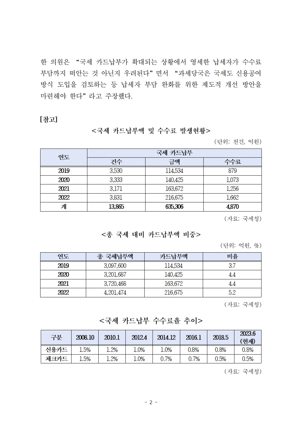[한병도의원]2023기재위국정감사보도자료(11)_카드로 낸 국세 3년새 10조원 증가... 수수료 4870억원은 납세자 몫.hwp