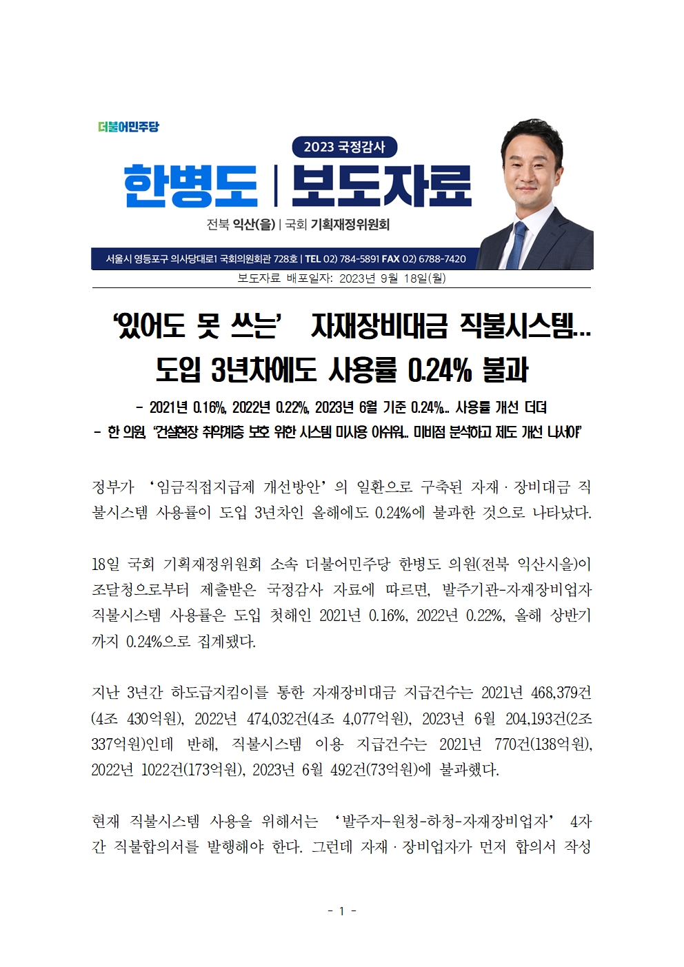 [국회의원 한병도 국감 보도자료] ‘있어도 못 쓰는’ 자재장비대금 직불시스템... 도입 3년차에도 사용률 0.24% 불과
