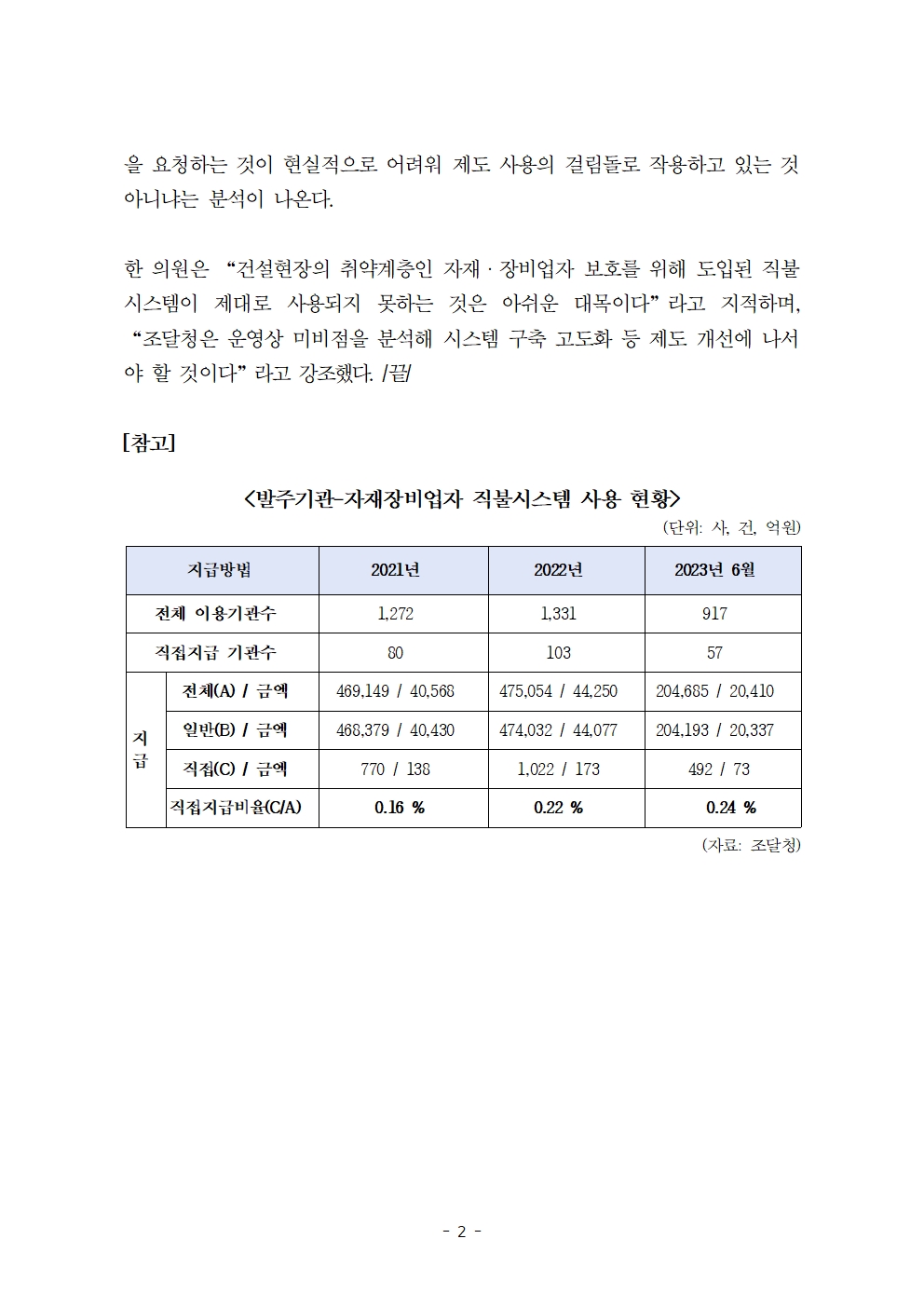[한병도의원]2023기재위국정감사보도자료(13)_‘있어도 못 쓰는’ 자재장비대금 직불시스템... 도입 3년차에도 사용률 0.24% 불과.hwp
