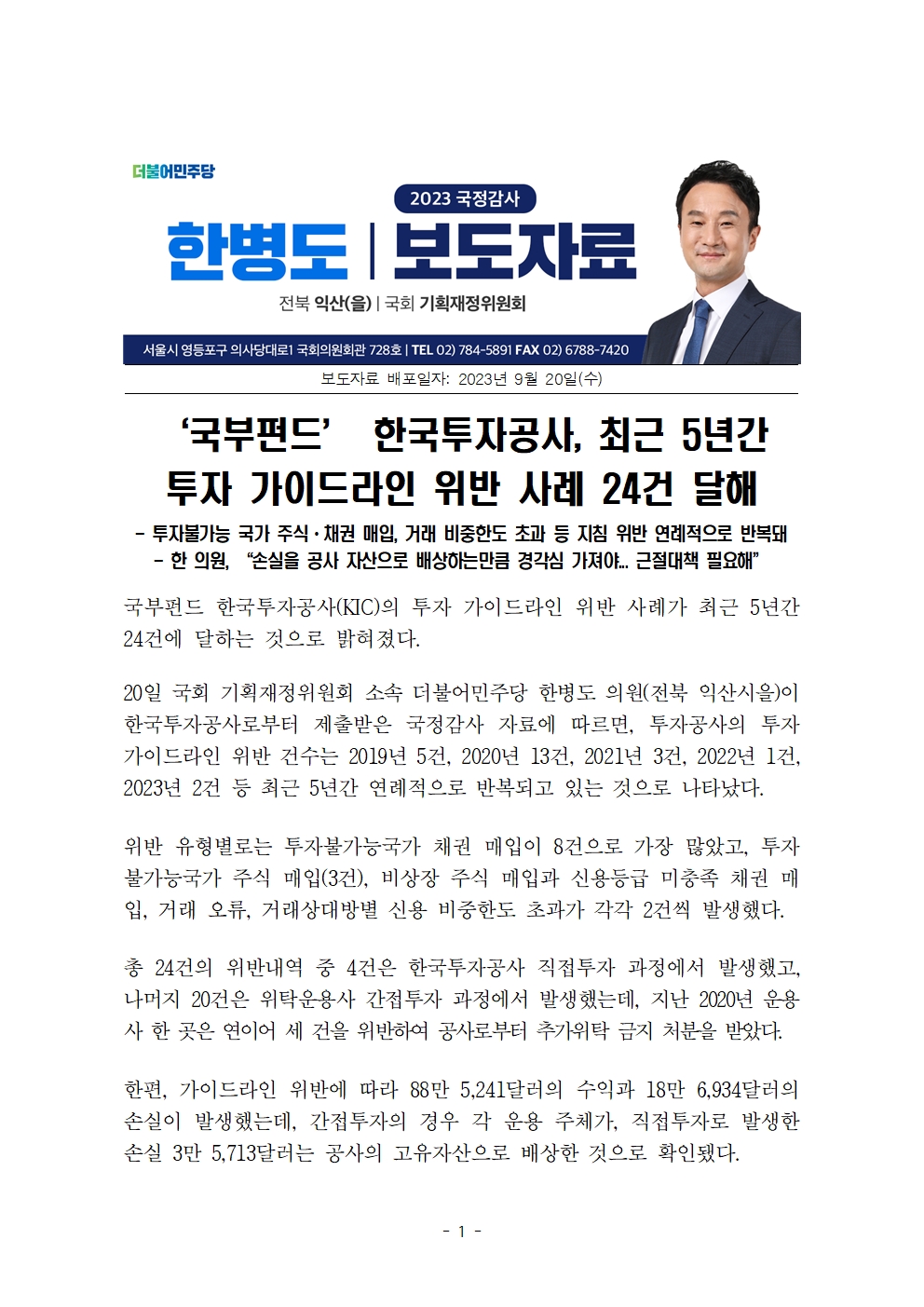 [한병도의원]2023기재위국정감사보도자료(15)_국부펀드 한국투자공사 최근 5년간 투자 가이드라인 위반 사례 24건 달해.hwp