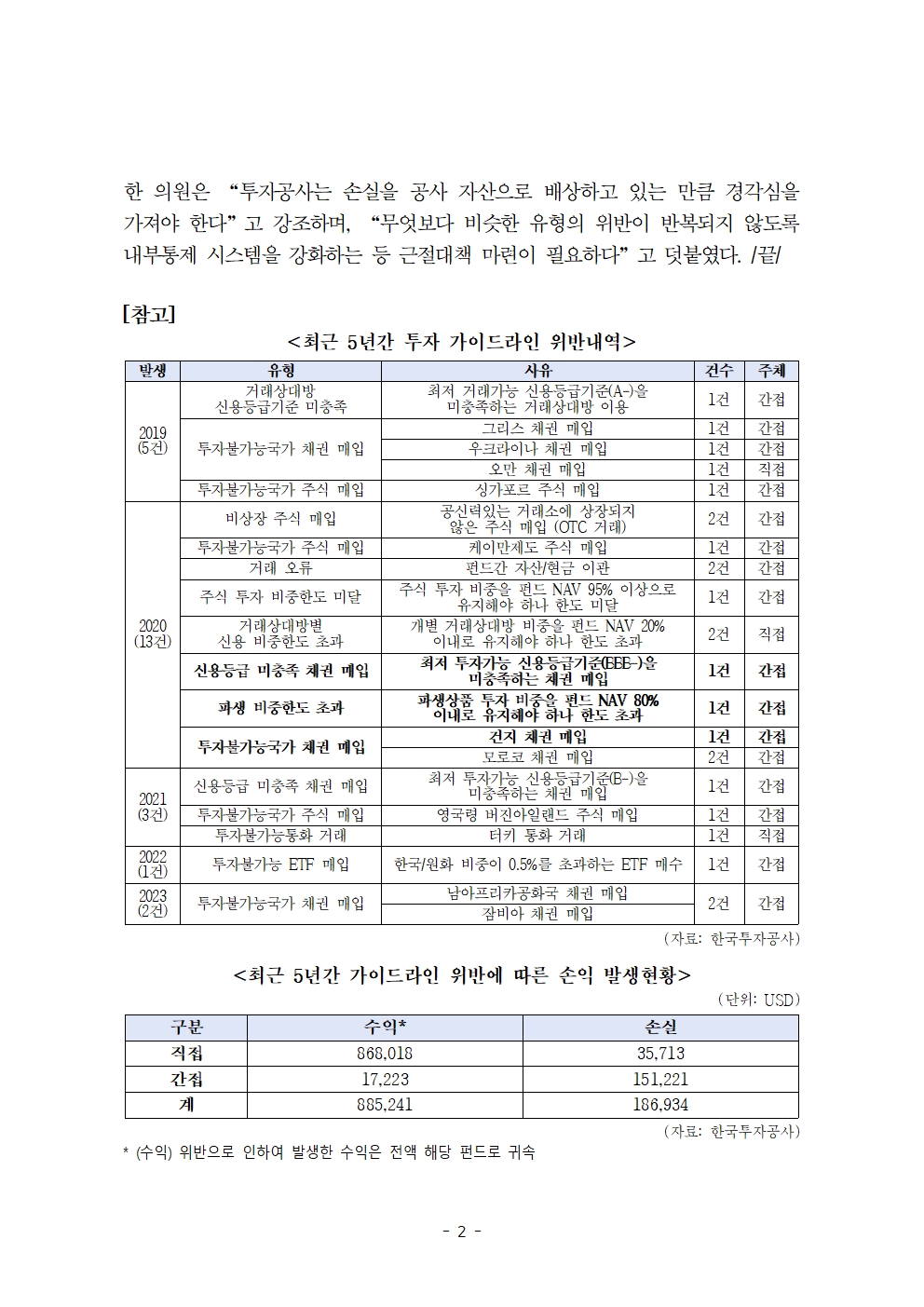 [국회의원 한병도 국감 보도자료] '국부펀드' 한국투자공사, 최근 5년간 투자 가이드라인 위반 사례 24건 달해