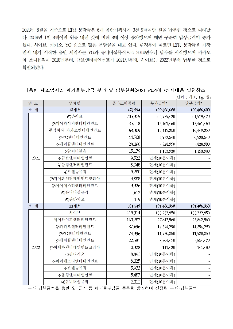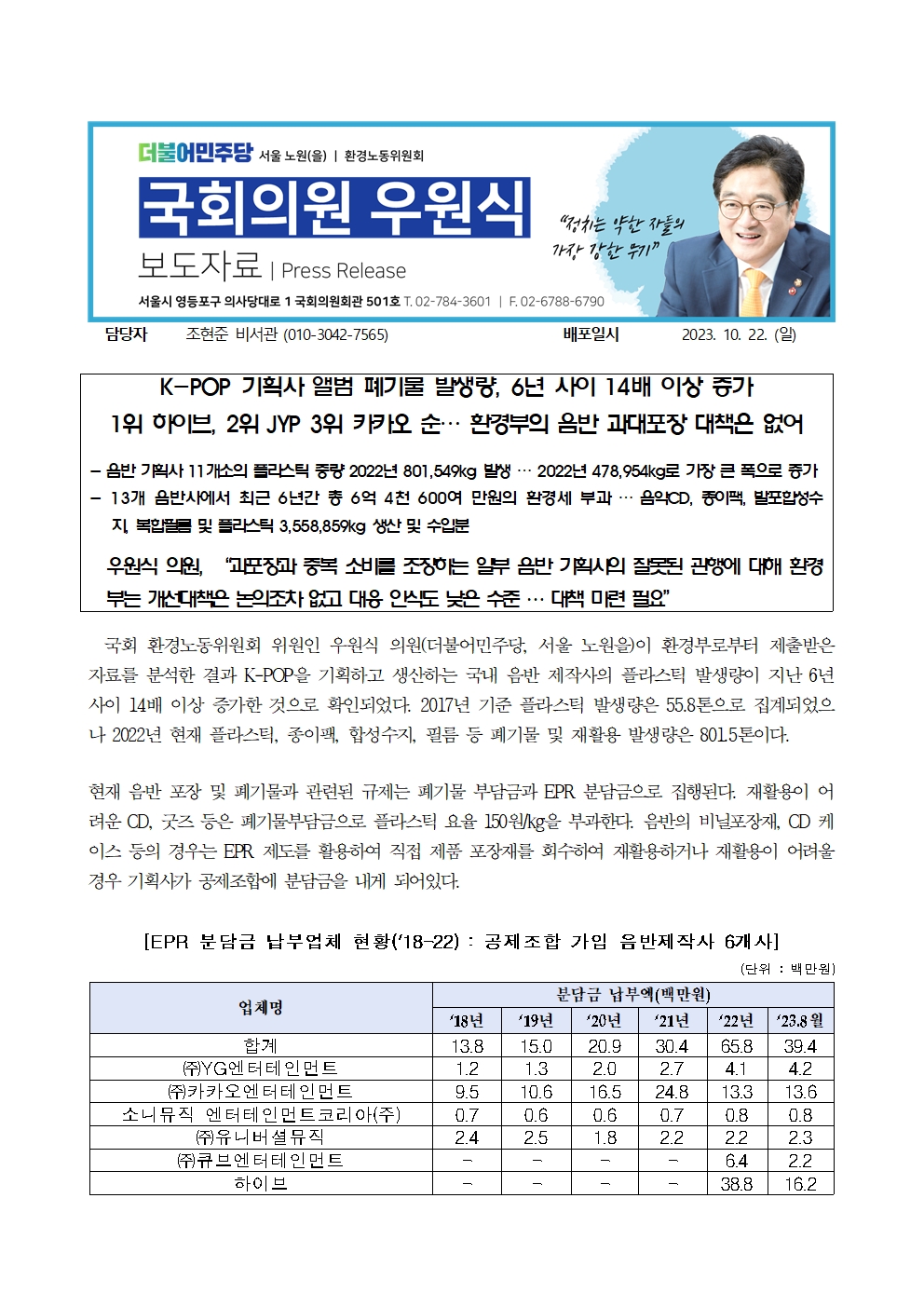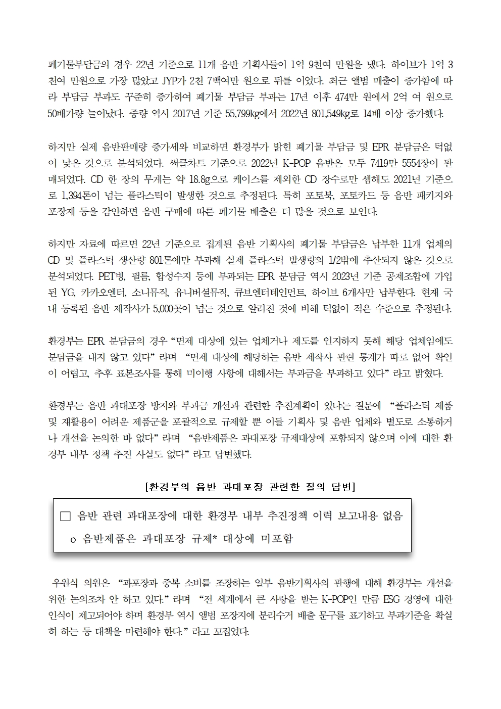 [우원식 의원 보도자료] K-POP 기획사 앨범 폐기물 발생량, 6년 사이 14배 이상 증가