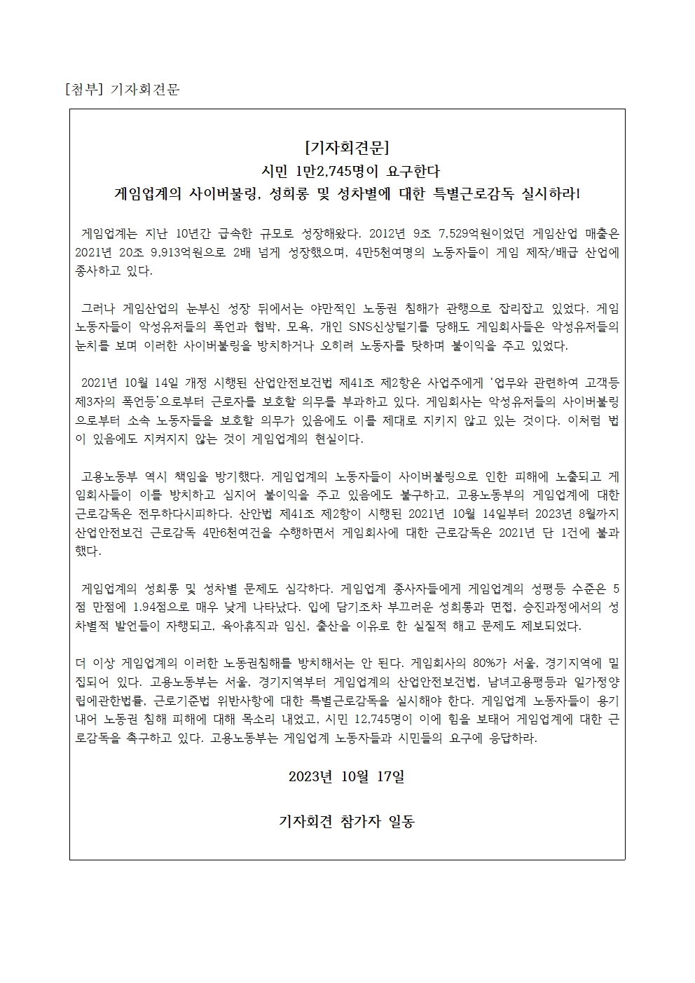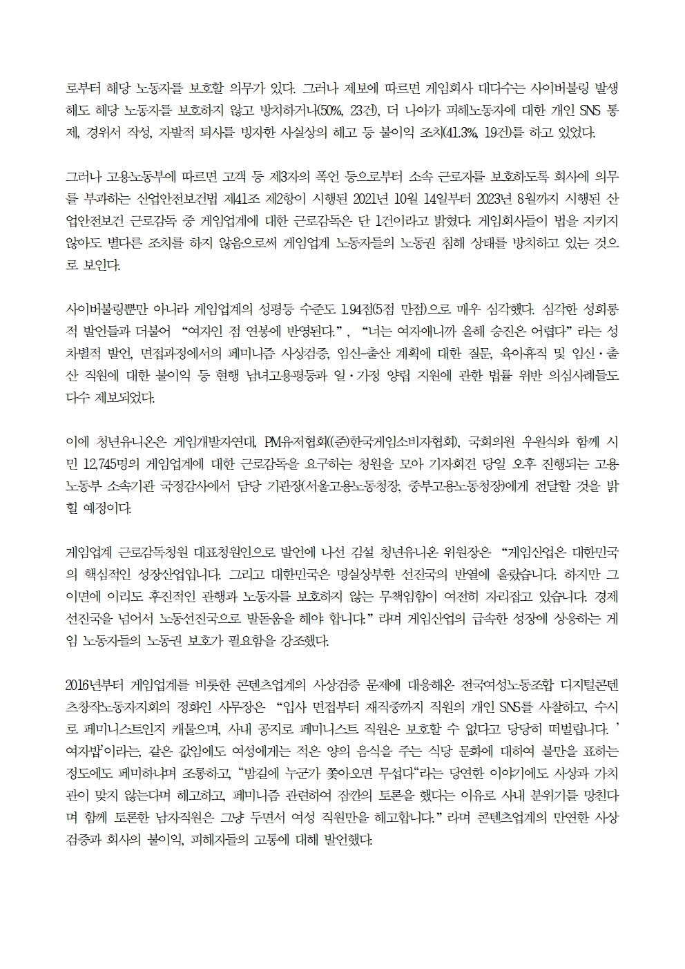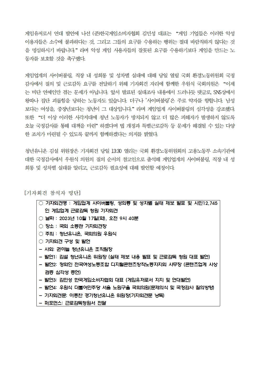 [우원식 의원 보도자료] 게임업계 사이버불링, 성희롱 및 성차별 실태 제보 발표 및 시민 12,745인 게임업계 근로감독 청원