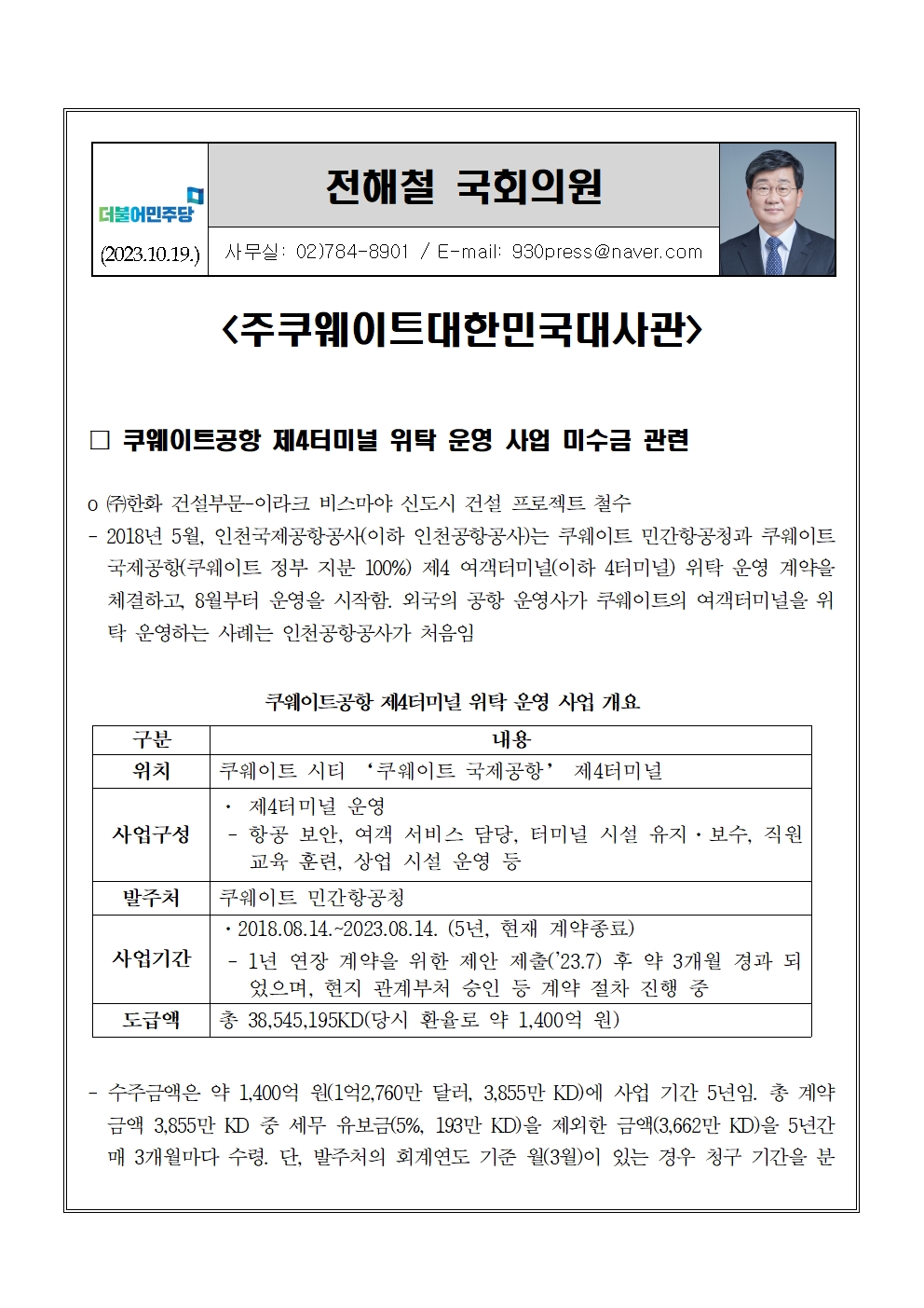 [전해철의원 국정감사 보도자료] 쿠웨이트공항 제4터미널 위탁 운영 사업 미수금 관련