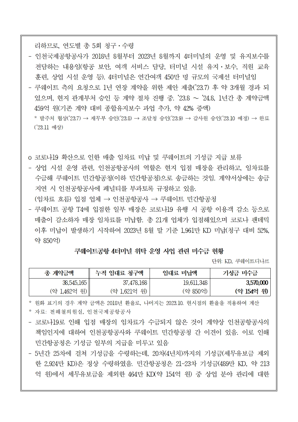 [전해철의원실 국정감사 보도자료] 쿠웨이트공항 제4터미널 위탁 운영 사업 미수금 관련 (23.10.19).hwp