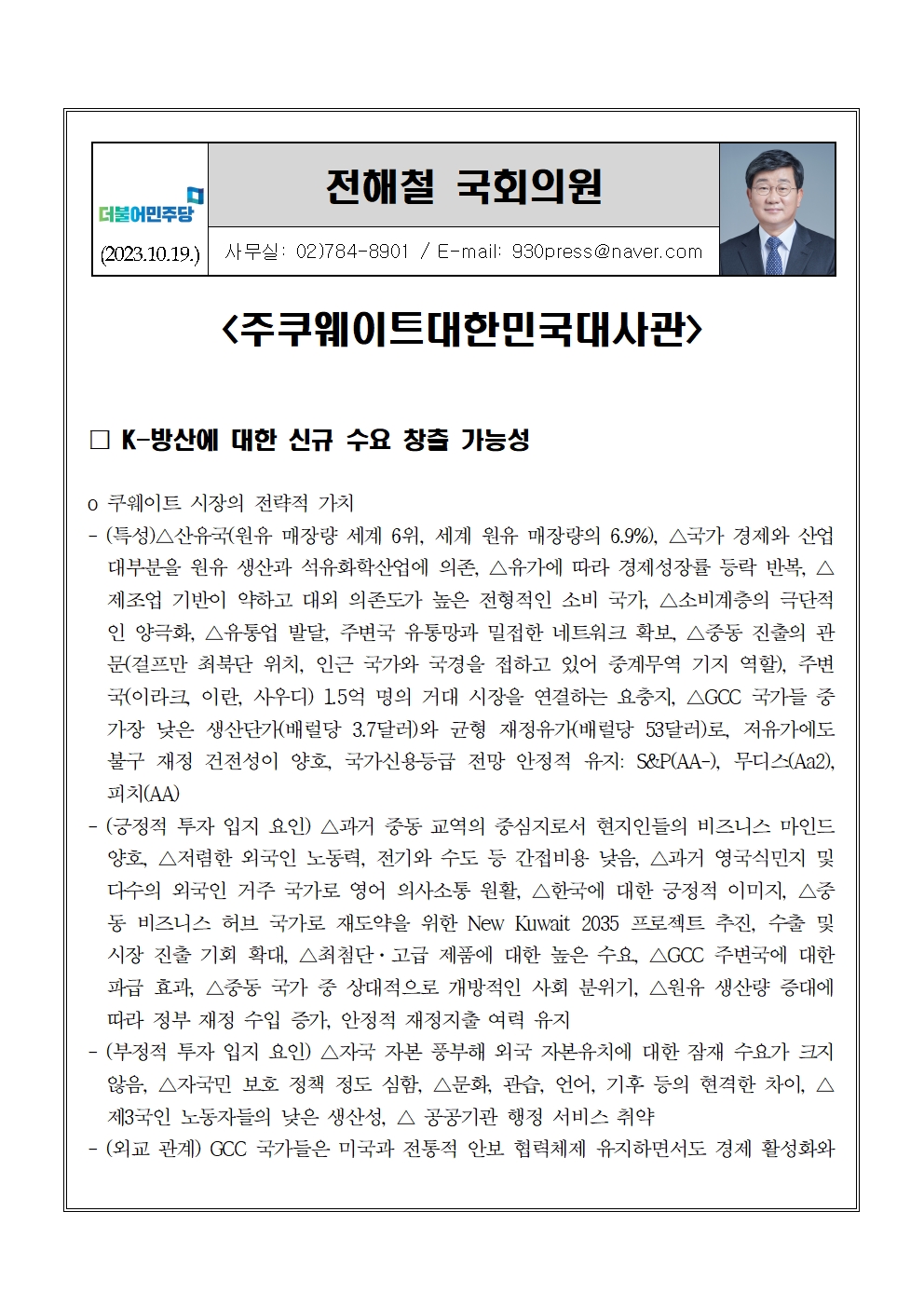[전해철의원실 국정감사 보도자료] K-방산에 대한 신규 수요 창출 가능성 (23.10.19).hwp