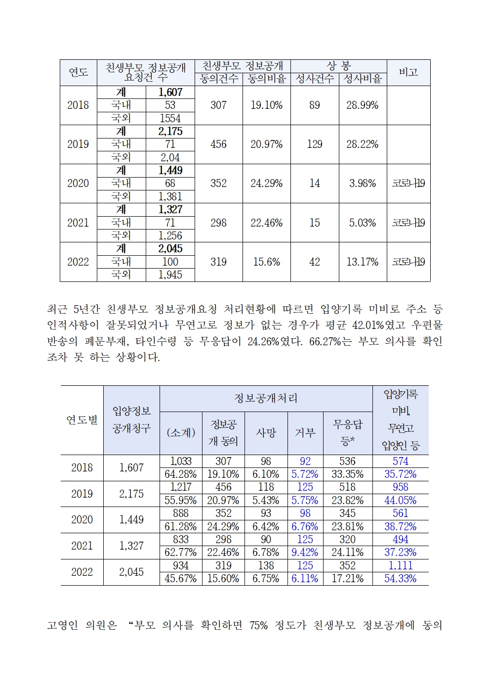 [국정감사 보도자료] 고영인 의원“입양인 친생부모 의사 확인율 27%, 정부 입양인 알 권리 침해”