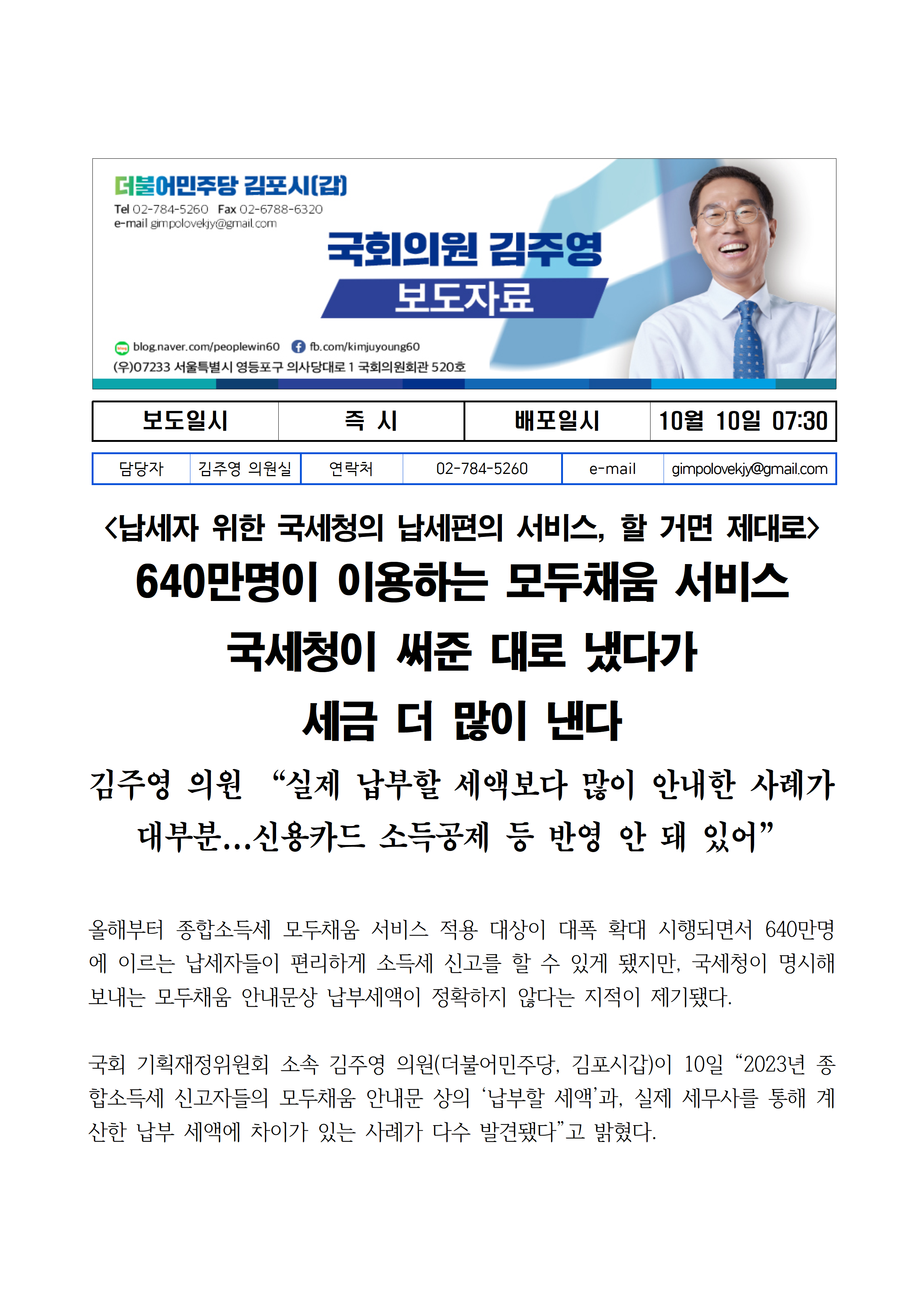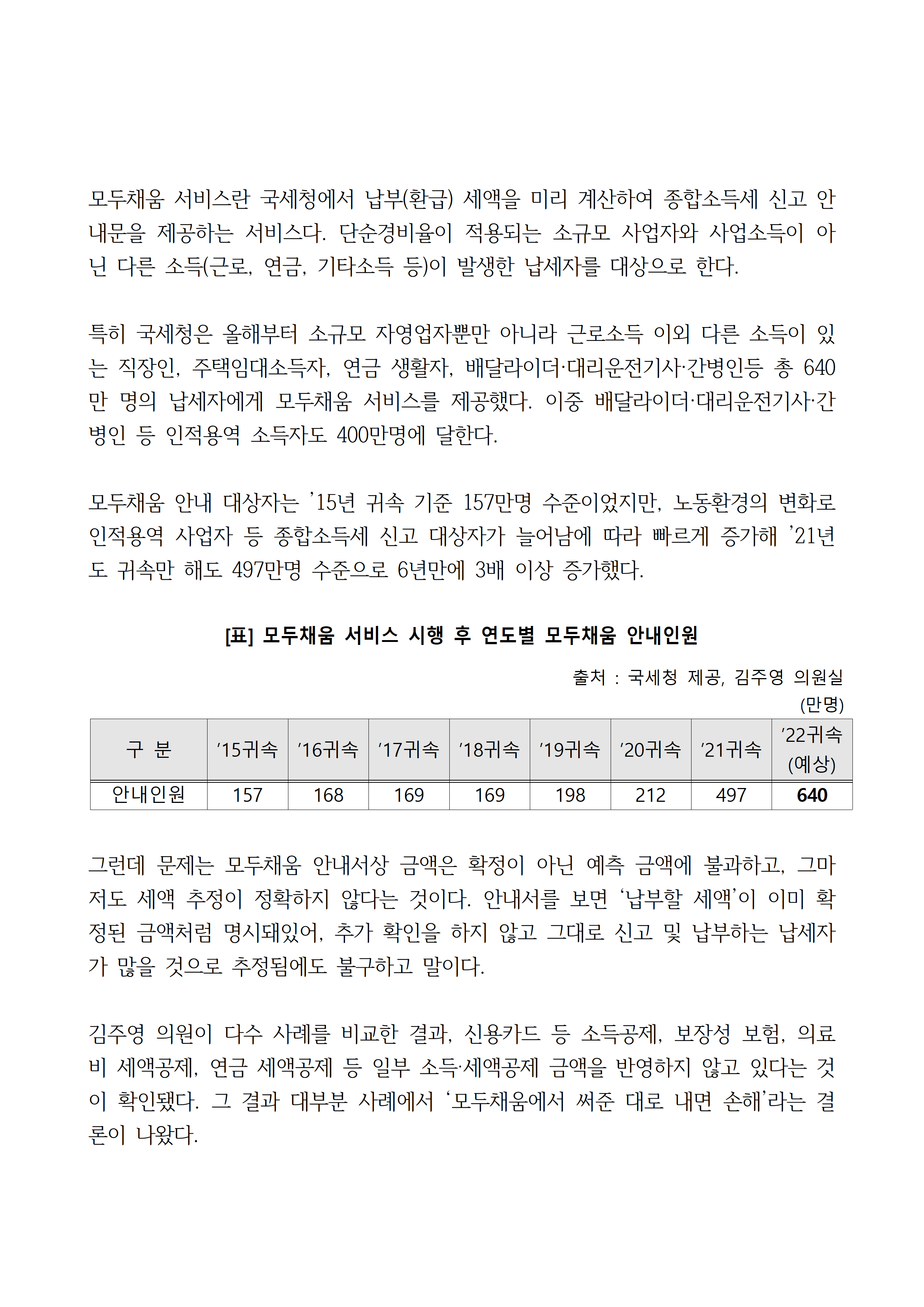 231010_국감보도자료_김주영_의원_640만명이 이용하는 모두채움 서비스 국세청이 써준 대로 냈다가 세금 더 많이 낸다.hwp