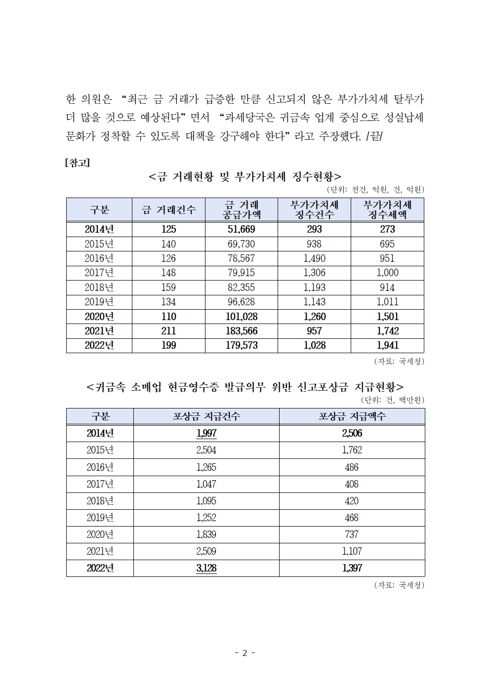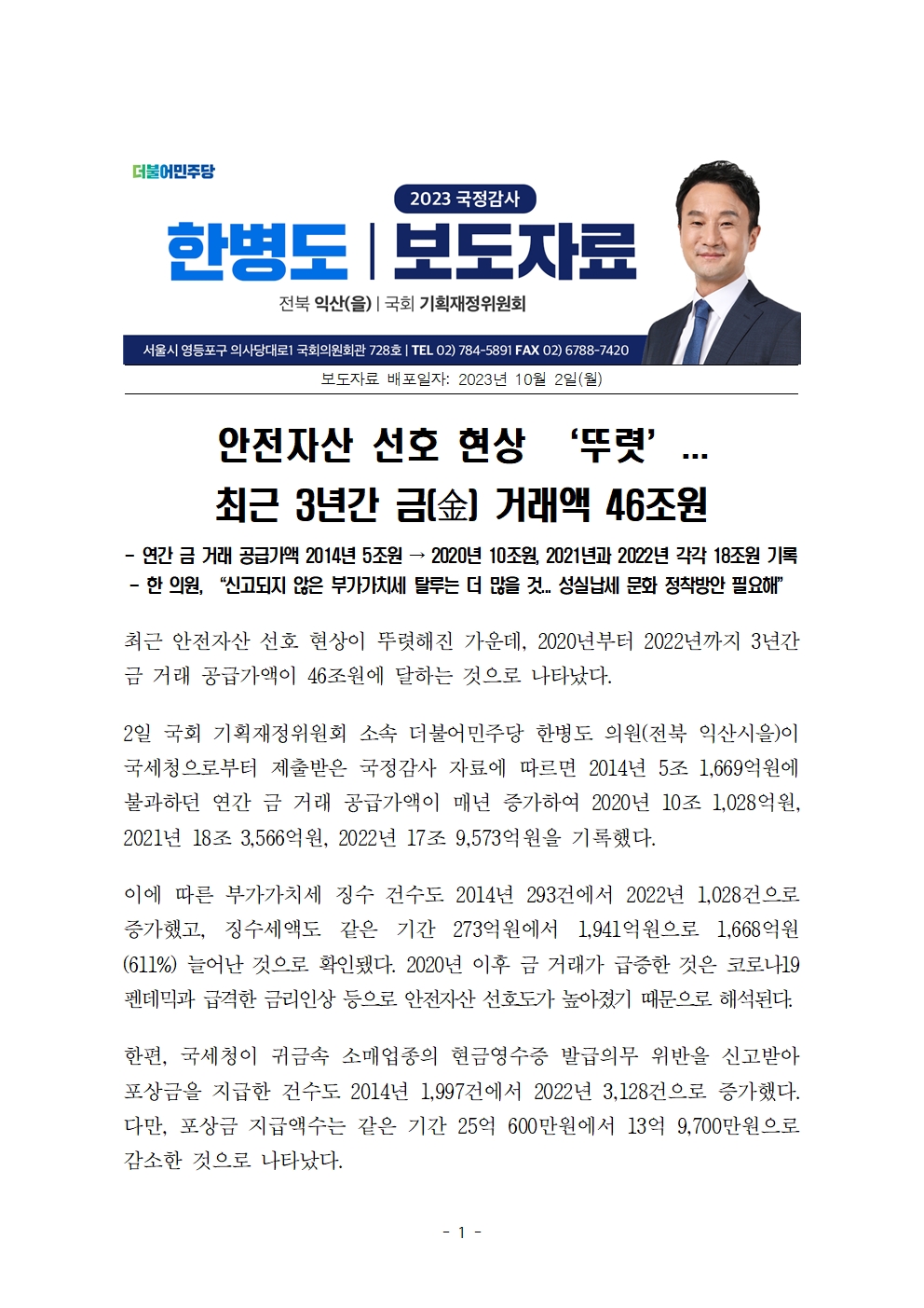 [한병도의원]2023기재위국정감사보도자료(21)_안전자산 선호 현상 ‘뚜렷’... 최근 3년간 금(金) 거래액 46조원.hwp