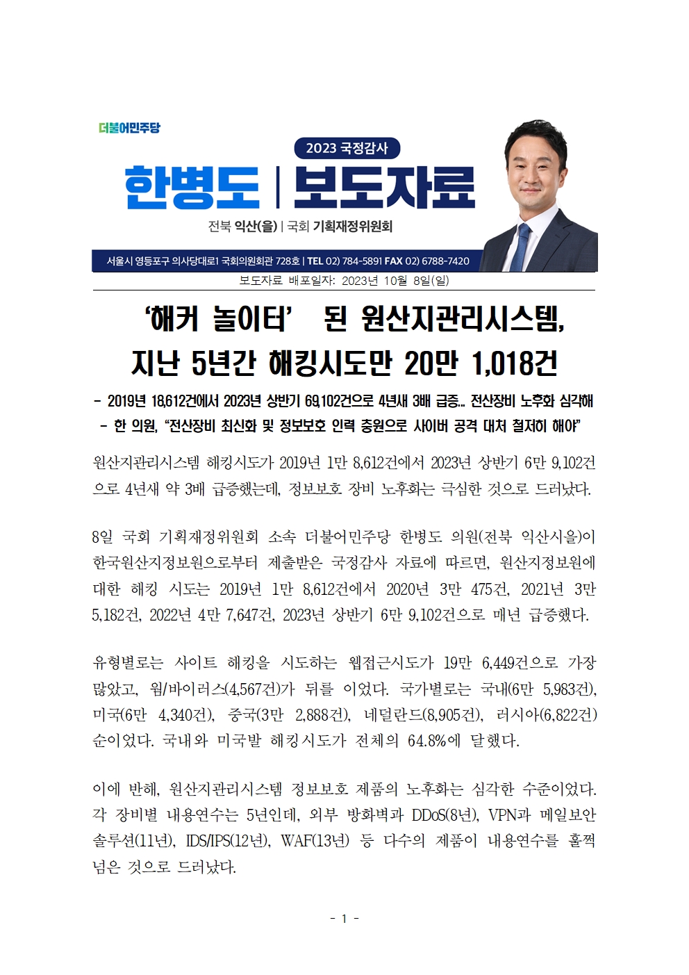 [한병도의원]2023기재위국정감사보도자료(25)_‘해커 놀이터’ 된 원산지관리시스템 지난 5년간 해킹시도만 20만 1018건.hwp
