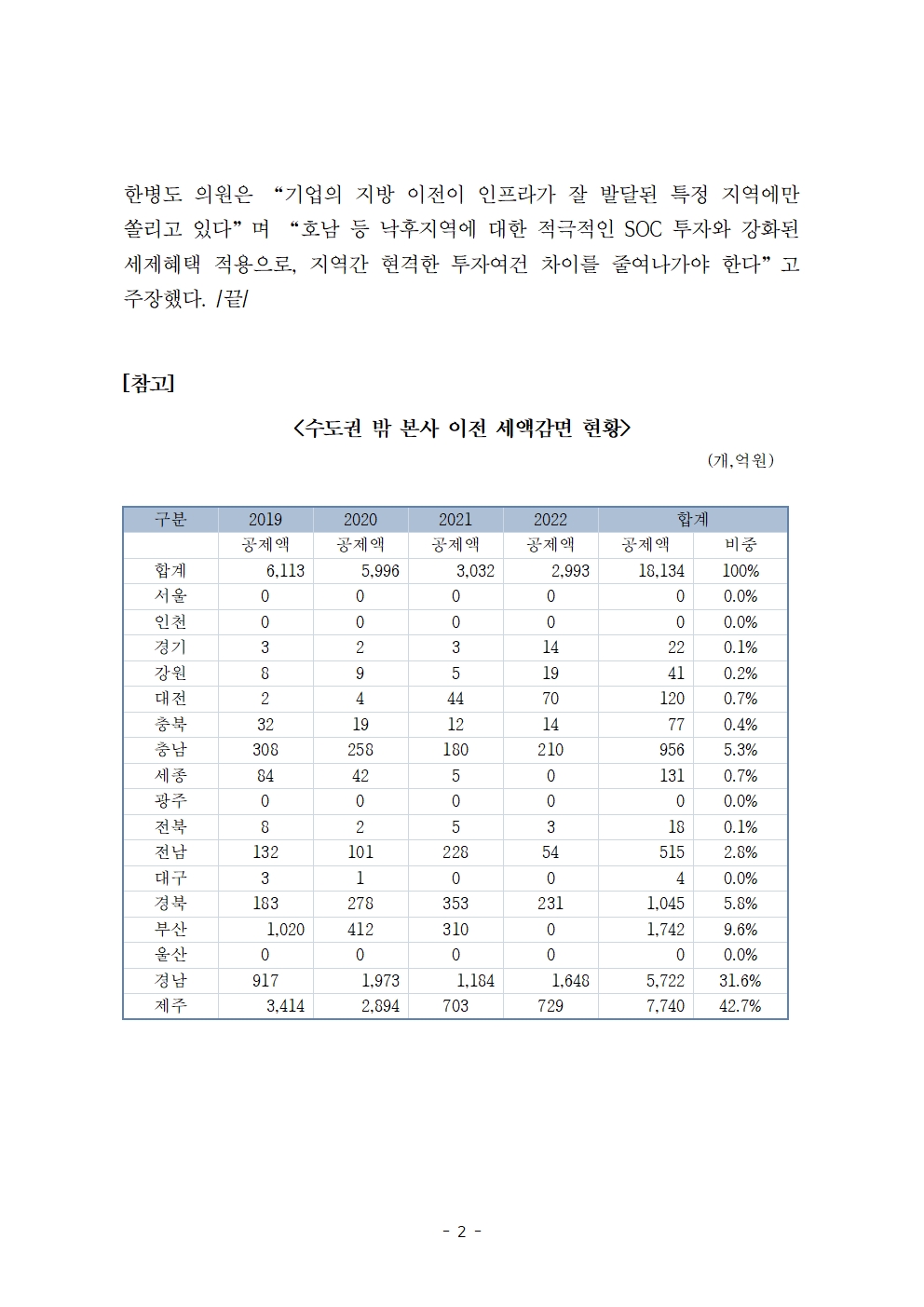 [한병도의원]2023기재위국정감사보도자료(32)_수도권 밖 본사 이전 세액공제 비수도권內 ‘쏠림’ 심각.hwp