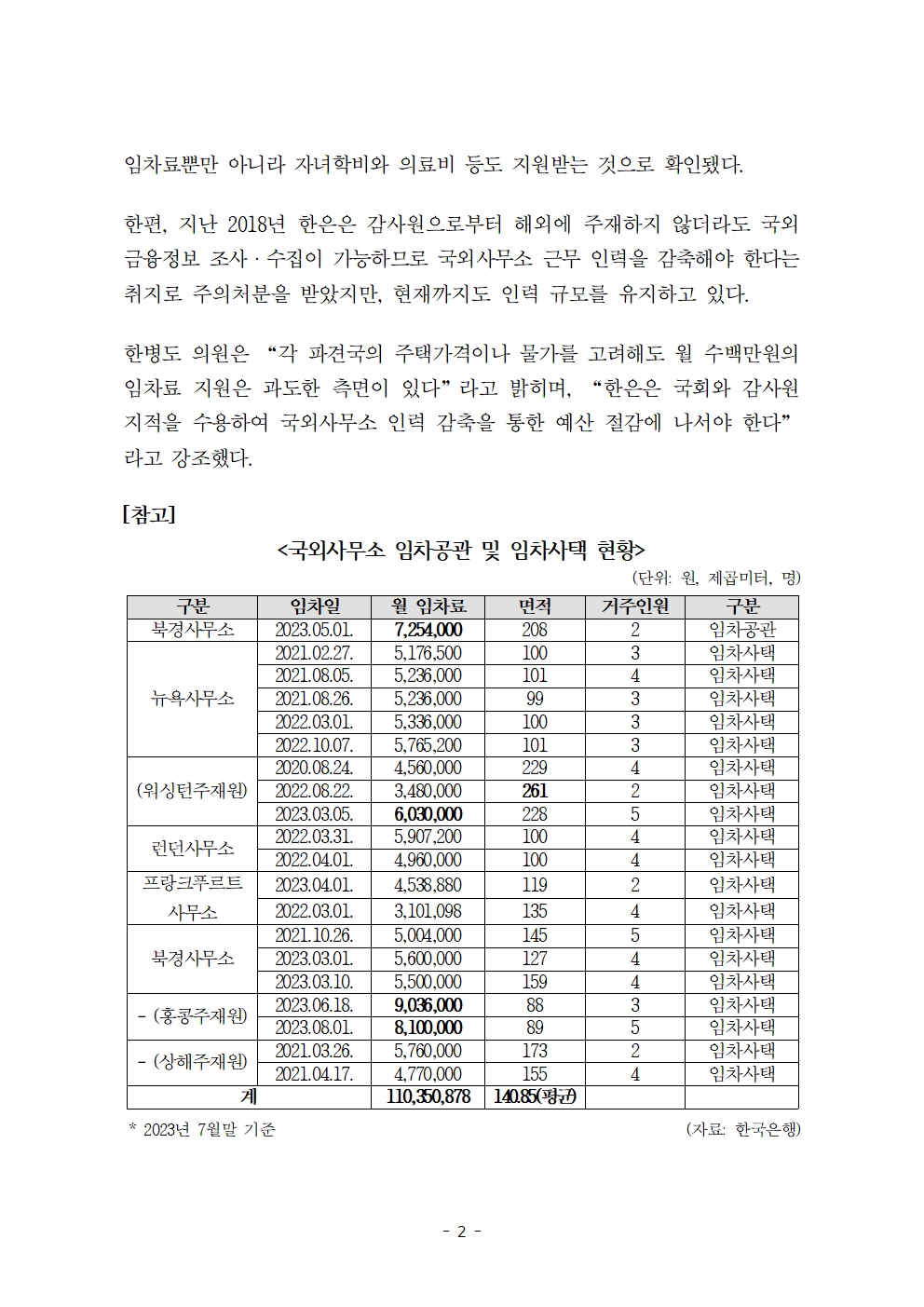 [한병도의원]2023기재위국정감사보도자료(35)_월세 900만원 고가 임차사택 거주하는 한은 국외사무소 직원... 예산 낭비 우려.hwp
