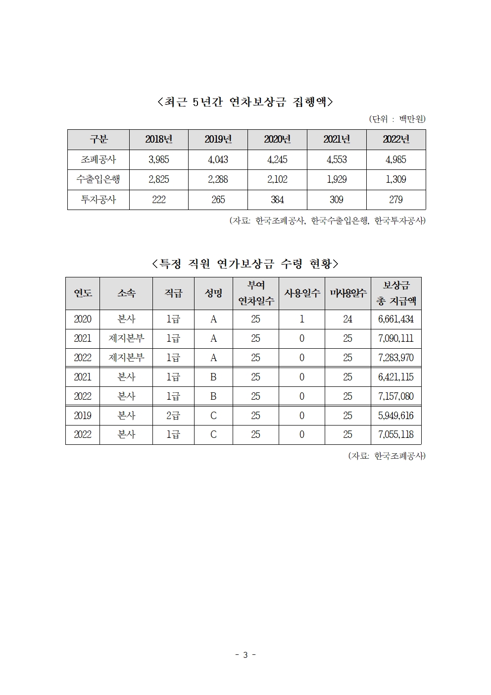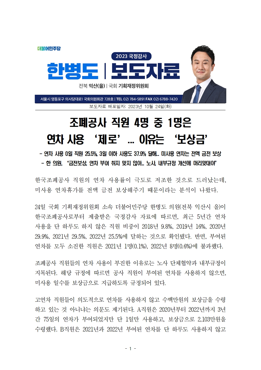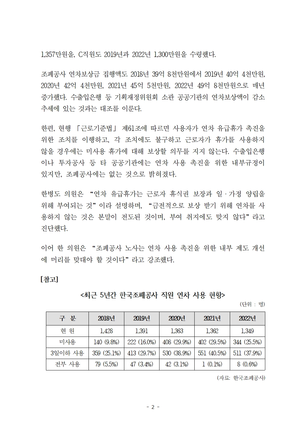 [한병도의원]2023기재위국정감사보도자료(37)_조폐공사 직원 4명 중 1명은 연차 사용 제로... 이유는 보상금.hwp