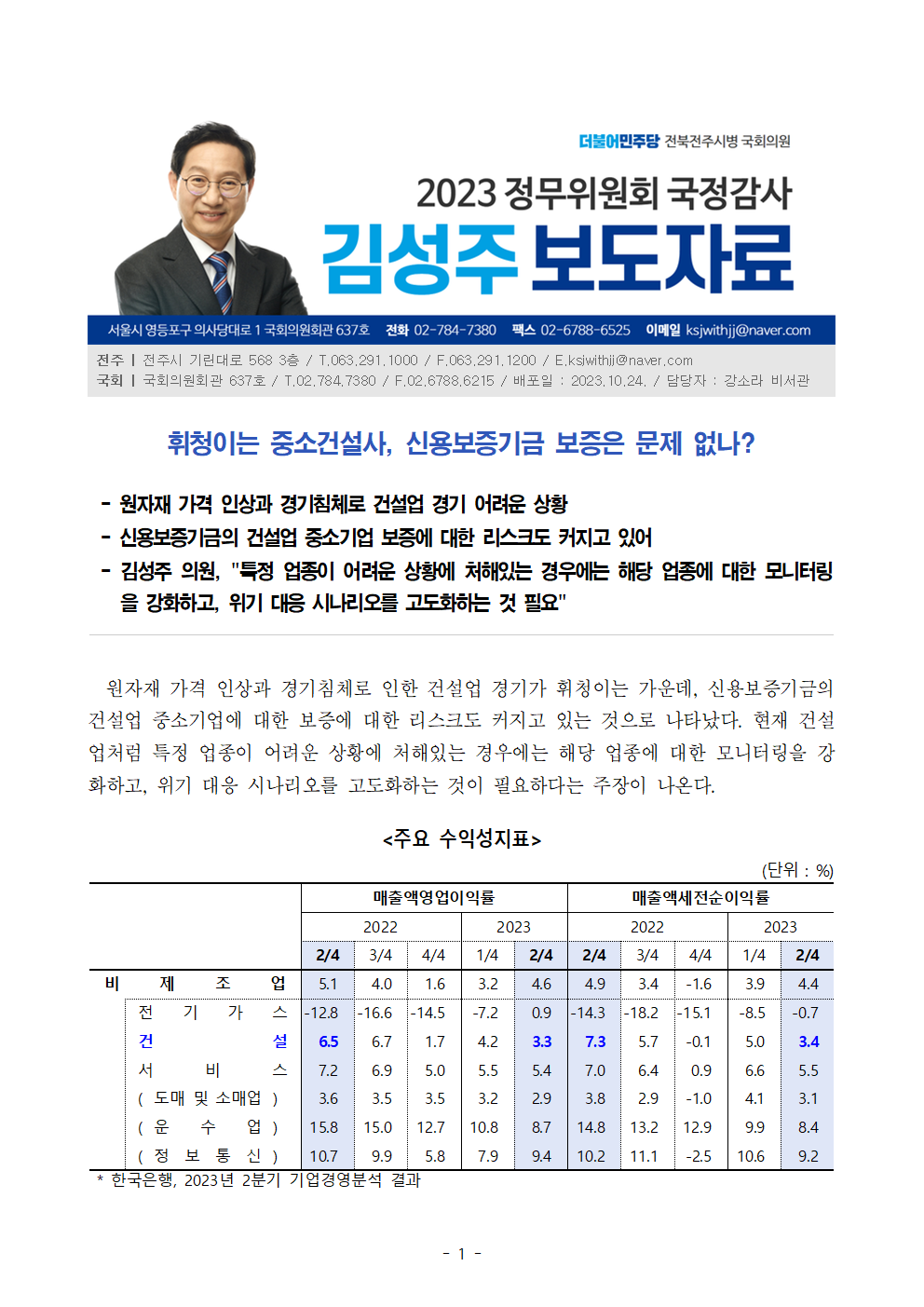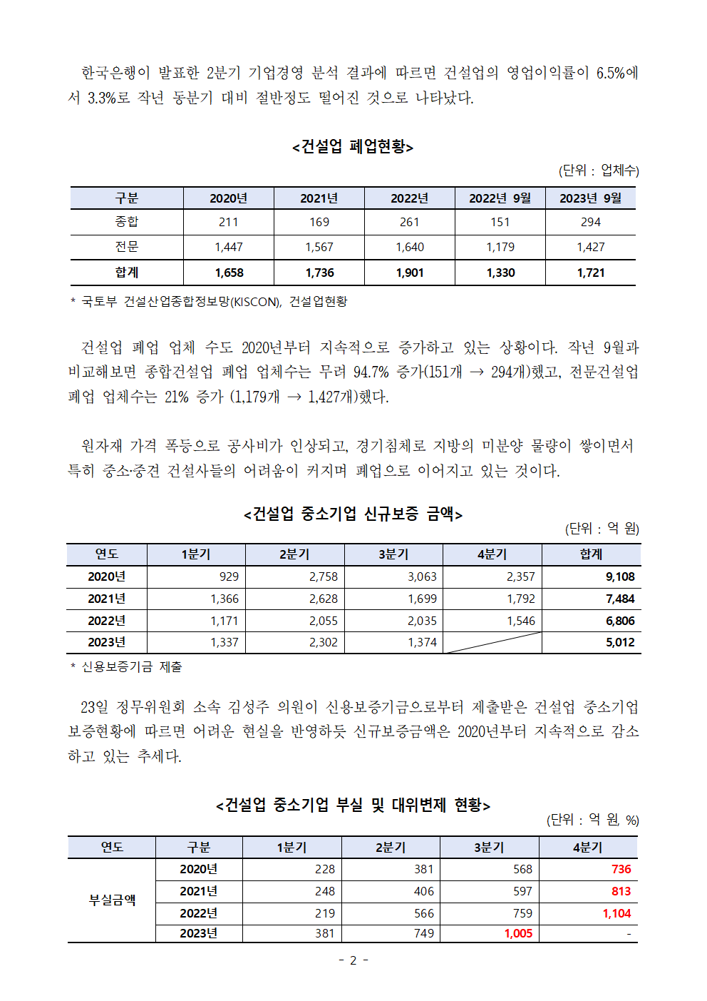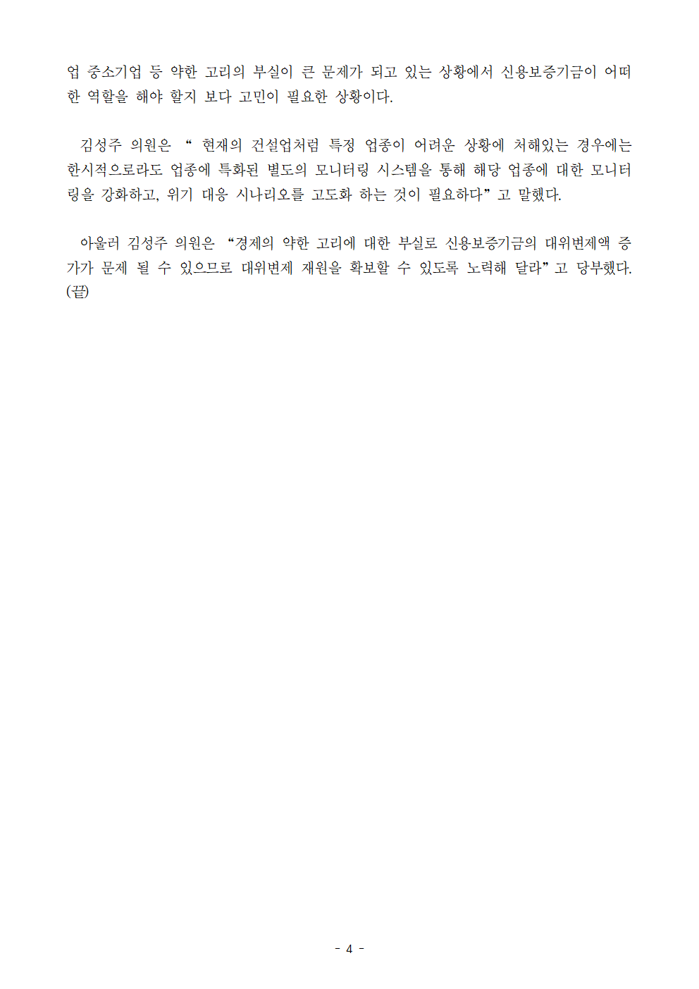 [김성주의원 보도자료] 휘청이는 중소건설사, 신용보증기금 보증은 문제 없나?