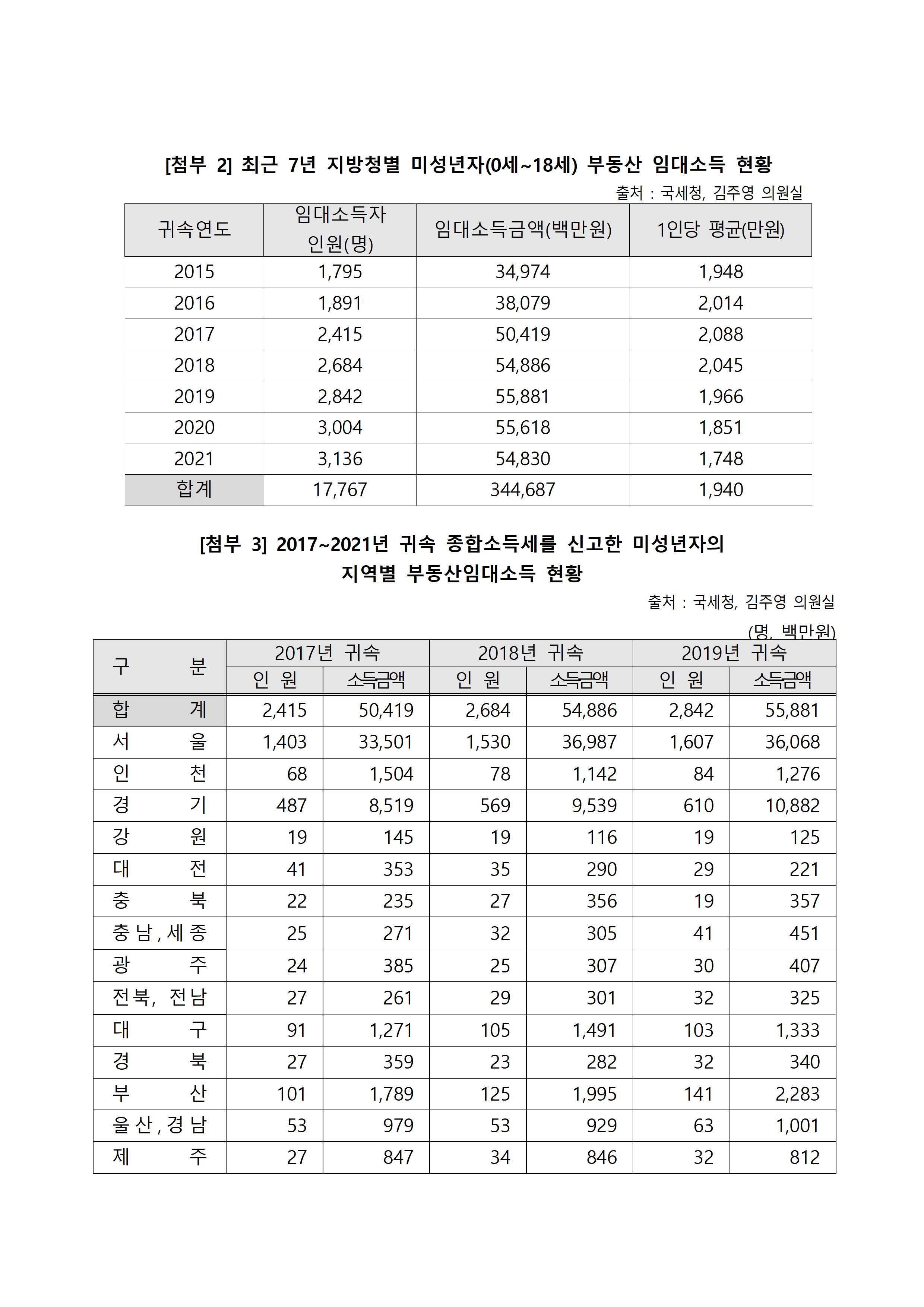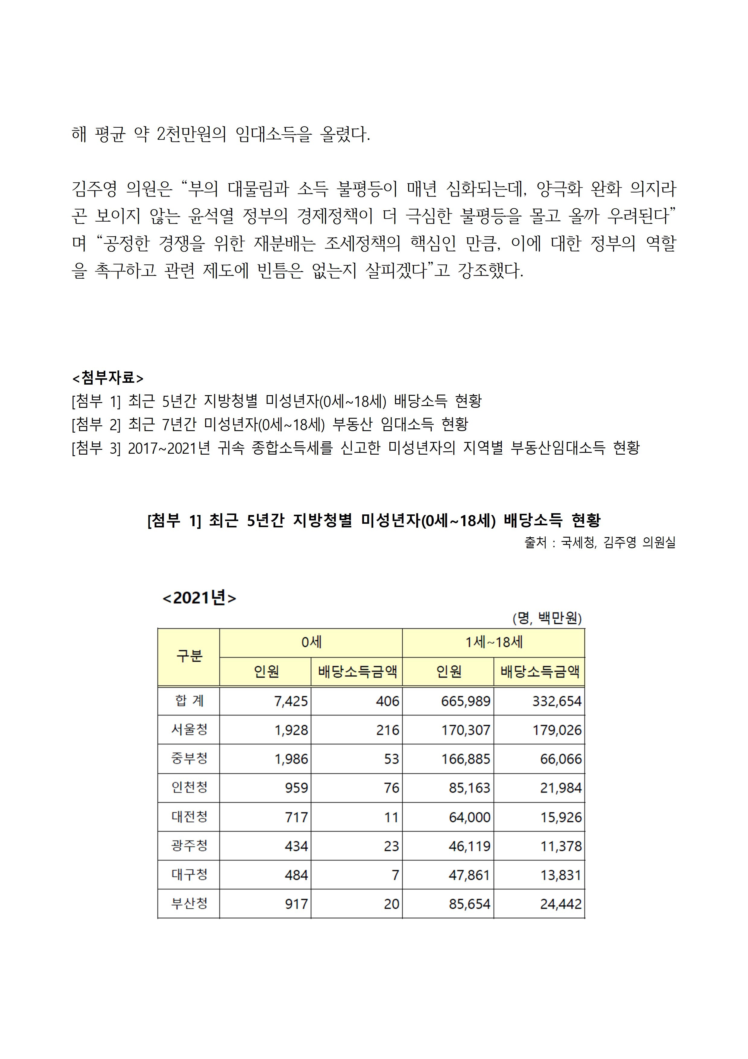 [김주영 의원 국감보도자료]증여세 절세 비법 ‘빨리빨리’? 태어나보니 ‘배당금 입금’, 0세 주식 배당소득자 7,425명으로 1년 만에 3배 급증
