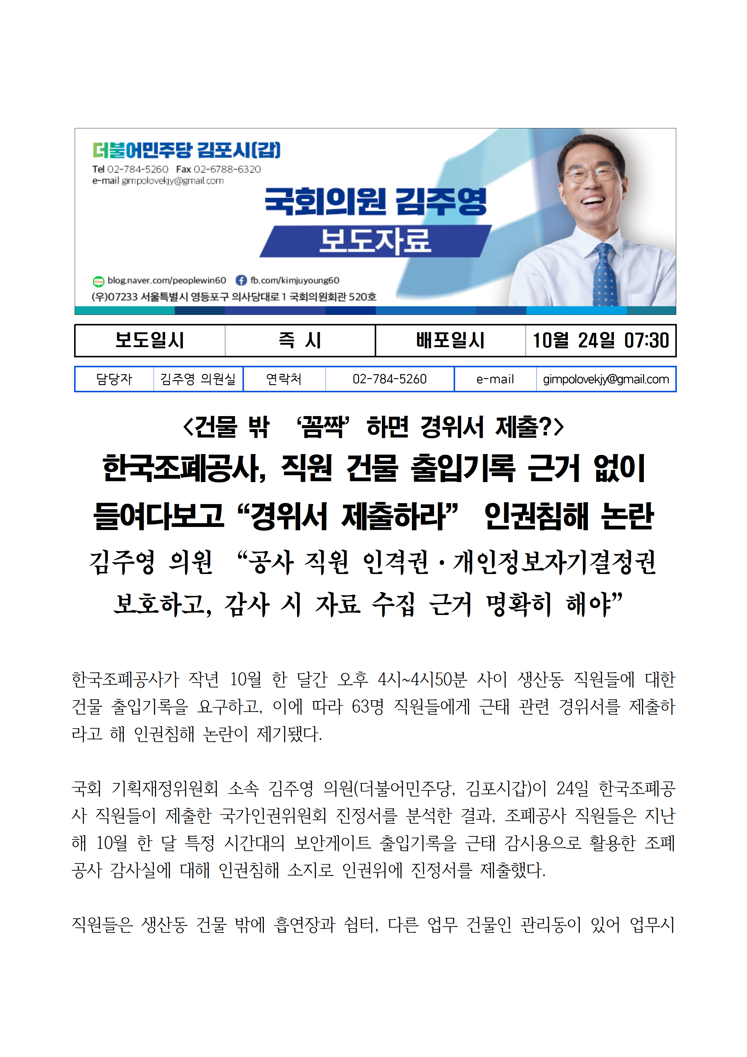 231024_국감보도자료_김주영_의원_한국조폐공사_직원 출입기록 임의로 들여다보고 경위서 제출 요구한 감사실 인권침해 논란.hwp